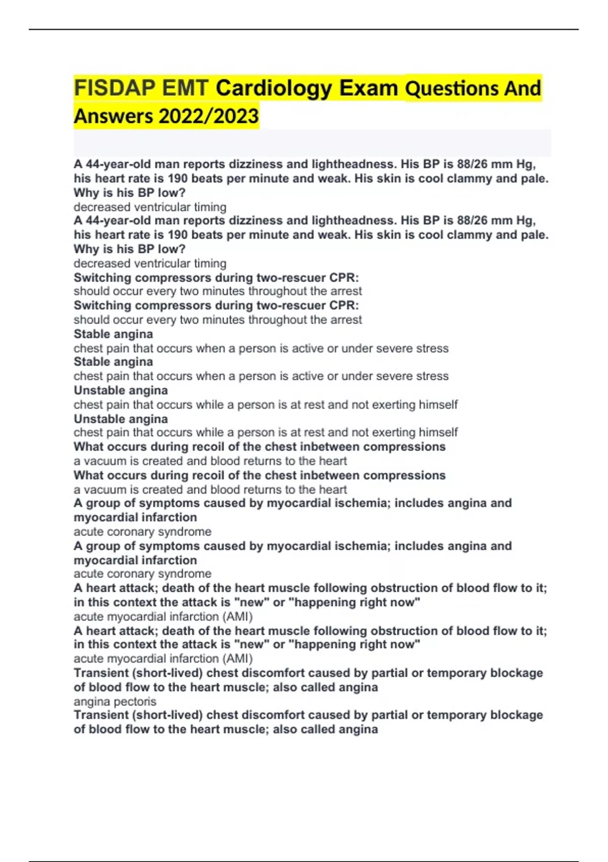 FISDAP EMT Airway Exam Complete Solution 2022/2023 aerobic metabolism Metabolism that can proceed only in the presence of oxygen. agonal gasps occasional, gasping breaths that occur after the heart has stopped alveolar minute volume The volume of air moved through the lungs in 1 minute minus the dead space; calculated by multiplying tidal volume (minus dead space) and respiratory rate. alveolar ventilation The volume of air that reaches the alveoli. It is determined by subtracting the amount of dead space air from the tidal volume. American Standard System A safety system for large oxygen cylinders, designed to prevent the accidental attachment of a regulator to a cylinder containing the wrong type of gas. anaerobic metabolism The metabolism that takes place in the absence of oxygen; the principle product is lactic acid. apnea absence of spontaneous breathing aspiration In the context of airway, the introduction of vomitus or other foreign material into the lungs. ataxic respirations Irregular, ineffective respirations that may or may not have an identifiable pattern. automatic transport ventilator (ATV) A ventilation device attached to a control box that allows the variables of ventilation to be set. It frees the EMT to perform other tasks while the patient is being ventilated. bag-valve mask (BVM) A device with a one-way valve and a face mask attached to a ventilation bag; when attached to a reservoir and connected to oxygen, it delivers more than 90% supplemental oxygen. barrier device A protective item, such as a pocket mask with a valve, that limits exposure to a patient's body fluids. bilateral A body part or condition that appears on both sides of the midline. Bronchioles Subdivision of the smaller bronchi in the lungs; made of smooth muscle and dilate or constrict in response to various stimuli. capnography A noninvasive method to quickly and efficiently provide information on a patient's ventilatory status, circulation, and metabolism; effectively measures the concentration of carbon dioxide in expired air over time. Capnometry A device that measures the amount of expired carbon dioxide. carina Point at which the trachea bifurcates (divides) into the left and right mainstem bronchi. Chemoreceptors Monitor the levels of O2, CO2, and the pH of the cerebrospinal fluid and then provide feedback to the respiratory centers to modify the rate and depth of breathing based on the body's needs at any given time. compliance The ability of the alveoli to expand when air is drawn in during inhalation. continuous positive airway pressure (CPAP) A method of ventilation used primarily in the treatment of critically ill patients with respiratory distress; can prevent the need for endotracheal intubation. dead space The portion of the tidal volume that does not reach the alveoli and thus does not participate in gas exchange. Diffusion A process in which molecules move from an area of higher concentration to an area of lower concentration. Dyspnea shortness of breath End Tital CO2 the amount of carbon dioxide present at the end of an exhaled breath Exhalation The passive part of the breathing process in which the diaphragm and the intercostal muscles relax, forcing air out of the lungs. external respiration the exchange of gases between the lungs and the blood cells in the pulmonary capillaries; also called pulmonary respiration gag reflex A normal reflex mechanism that causes retching; activated by touching the soft palate or the back of the throat. gastric distention A condition in which air fills the stomach, often as a result of high volume and pressure during artificial ventilation. glottis The space in between the vocal cords that is the narrowest portion of the adult's airway; also called the glottic opening. good air exchange A term used to distinguish the degree of distress in a patient with a mild airway obstruction. With good air exchange, the patient is still conscious and able to cough forcefully, although wheezing may be heard. head tilt-chin lift maneuver