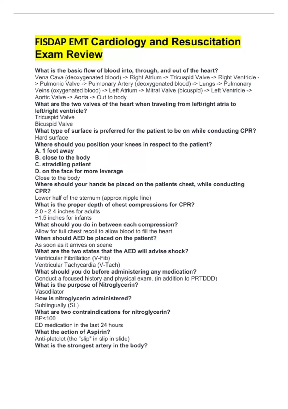 FISDAP EMT Cardiology and Resuscitation Exam Review What is the basic flow of blood into, through, and out of the heart? Vena Cava (deoxygenated blood) -> Right Atrium -> Tricuspid Valve -> Right Ventricle -> Pulmonic Valve -> Pulmonary Artery (deoxygenated blood) -> Lungs -> Pulmonary Veins (oxygenated blood) -> Left Atrium -> Mitral Valve (bicuspid) -> Left Ventricle -> Aortic Valve -> Aorta -> Out to body What are the two valves of the heart when traveling from left/right atria to left/right ventricle? Tricuspid Valve Bicuspid Valve What type of surface is preferred for the patient to be on while conducting CPR? Hard surface Where should you position your knees in respect to the patient? A. 1 foot away B. close to the body C. straddling patient D. on the face for more leverage Close to the body Where should your hands be placed on the patients chest, while conducting CPR? Lower half of the sternum (approx nipple line) What is the proper depth of chest compressions for CPR? 2.0 - 2.4 inches for adults ~1.5 inches for infants What should you do in between each compression? Allow for full chest recoil to allow blood to fill the heart When should AED be placed on the patient? As soon as it arrives on scene What are the two states that the AED will advise shock? Ventricular Fibrillation (V-Fib) Ventricular Tachycardia (V-Tach) What should you do before administering any medication? Conduct a focused history and physical exam. (in addition to PRTDDD) What is the purpose of Nitroglycerin? Vasodilator How is nitroglycerin administered? Sublingually (SL) What are two contraindications for nitroglycerin? BP<100 ED medication in the last 24 hours What the action of Aspirin? Anti-platelet (the "slip" in slip in slide) What is the strongest artery in the body? Aorta artery What is the strongest chamber in the heart? Left ventricle What are the layers of the heart (outer most -> inner most) Epicardium -> Myocardium -> Endocardium (epic means outer, and end means inner) Which arteries supply the myocardium with blood? Coronary arteries When is the systolic BP measured?