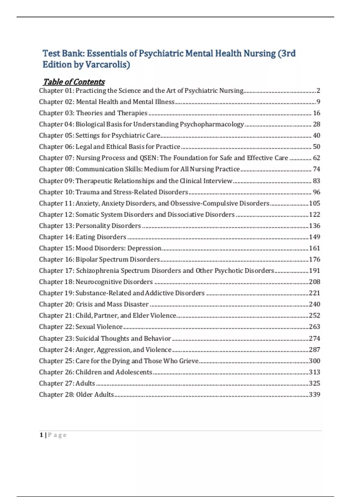 TEST BANK VARCAROLIS ESSENTIALS OF PSYCHIATRIC MENTAL HEALTH NURSING 3RD EDITIONTable of Contents Chapter 01: Practicing the Science and the Art of Psychiatric Nursing ................................................. 2 Chapter 02: Mental Health and Mental Illness ............................................................................................... 9 Chapter 03: Theories and Therapies .............................................................................................................. 16 Chapter 04: Biological Basis for Understanding Psychopharmacology ............................................. 28 Chapter 05: Settings for Psychiatric Care...................................................................................................... 40 Chapter 06: Legal and Ethical Basis for Practice ........................................................................................ 50 Chapter 07: Nursing Process and QSEN: The Foundation for Safe and Effective Care ............... 62 Chapter 08: Communication Skills: Medium for All Nursing Practice ................................................ 74 Chapter 09: Therapeutic Relationships and the Clinical Interview ..................................................... 83 Chapter 10: Trauma and Stress-Related Disorders ................................................................................... 96 Chapter 11: Anxiety, Anxiety Disorders, and Obsessive-Compulsive Disorders .......................... 105 Chapter 12: Somatic System Disorders and Dissociative Disorders ................................................. 122 Chapter 13: Personality Disorders ................................................................................................................ 136 Chapter 14: Eating Disorders .......................................................................................................................... 149 Chapter 15: Mood Disorders: Depression ................................................................................................... 161 Chapter 16: Bipolar Spectrum Disorders .................................................................................................... 176 Chapter 17: Schizophrenia Spectrum Disorders and Other Psychotic Disorders ....................... 191 Chapter 18: Neurocognitive Disorders ........................................................................................................ 208 Chapter 19: Substance-Related and Addictive Disorders ..................................................................... 221 Chapter 20: Crisis and Mass Disaster ........................................................................................................... 240 Chapter 21: Child, Partner, and Elder Violence ......................................................................................... 252 Chapter 22: Sexual Violence ............................................................................................................................. 263 Chapter 23: Suicidal Thoughts and Behavior ............................................................................................ 274 Chapter 24: Anger, Aggression, and Violence ............................................................................................ 287 Chapter 25: Care for the Dying and Those Who Grieve.......................................................................... 300 Chapter 26: Children and Adolescents ......................................................................................................... 313 Chapter 27: Adults ............................................................................................................................................... 325 Chapter 28: Older Adults ................................................................................................................................... 339 1 | P a g eChapter 01: Practicing the Science and the Art of Psychiatric Nursing MULTIPLE CHOICE 1. Which outcome, focused on recovery, would be expected in the plan of care for a patient living in the community and diagnosed with serious and persistent mental illness? Within 3 months, the patient will: a. deny suicidal ideation. b. report a sense of well-being. c. take medications as prescribed. d. attend clinic appointments on time. ANS: B Recovery emphasizes managing symptoms, reducing psychosocial disability, and improving role performance. The goal of recovery is to empower the individual with mental illness to achieve a sense of meaning and satisfaction in life and to function at the highest possible level of wellness. The incorrect options focus on the classic medical model rather than recovery. DIF: Cognitive Level: Application (Applying) REF: 2 TOP: Nursing Process: Outcomes Identification MSC: NCLEX: Health Promotion and Maintenance 2. In the shift-change report, an off-going nurse criticizes a patient who wears heavy makeup. Which comment by the nurse who receives the report best demonstrates advocacy? a. This is a psychiatric hospital. Craziness is what we are all about. b. Lets all show acceptance of this patient by wearing lots of makeup too. c. Your comments are inconsiderate and inappropriate. Keep the report objective. d. Our patients need our help to learn behaviors that will help them get along in society. ANS: D Accepting patients needs for self-expression and seeking to teach skills that will contribute to their well-being demonstrate respect and are important parts of advocacy. The on- coming nurse needs to take action to ensure that others are not prejudiced against the patient. Humor can be appropriate within the privacy of a shift report but not at the expense of respect for patients. Judging the off-going nurse in a critical way will create conflict. Nurses must show compassion for each other. DIF: Cognitive Level: Application (Applying) REF: 8 2 | P a g eTOP: Nursing Process: Implementation MSC: NCLEX: Safe, Effective 