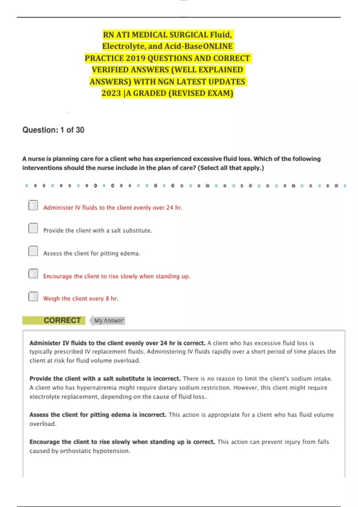 RN ATI MEDICAL SURGICAL Fluid, Electrolyte, and Acid-Base ONLINE PRACTICE 2019 QUESTIONS AND CORRECT VERIFIED ANSWERS (WELL EXPLAINED ANSWERS) WITH NGN LATEST UPDATES 2023 |A GRADED (REVISED EXAM)