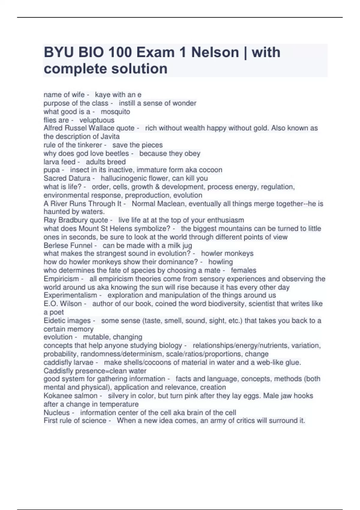 BYU BIO 100 Exam 1 Nelson | with complete solution