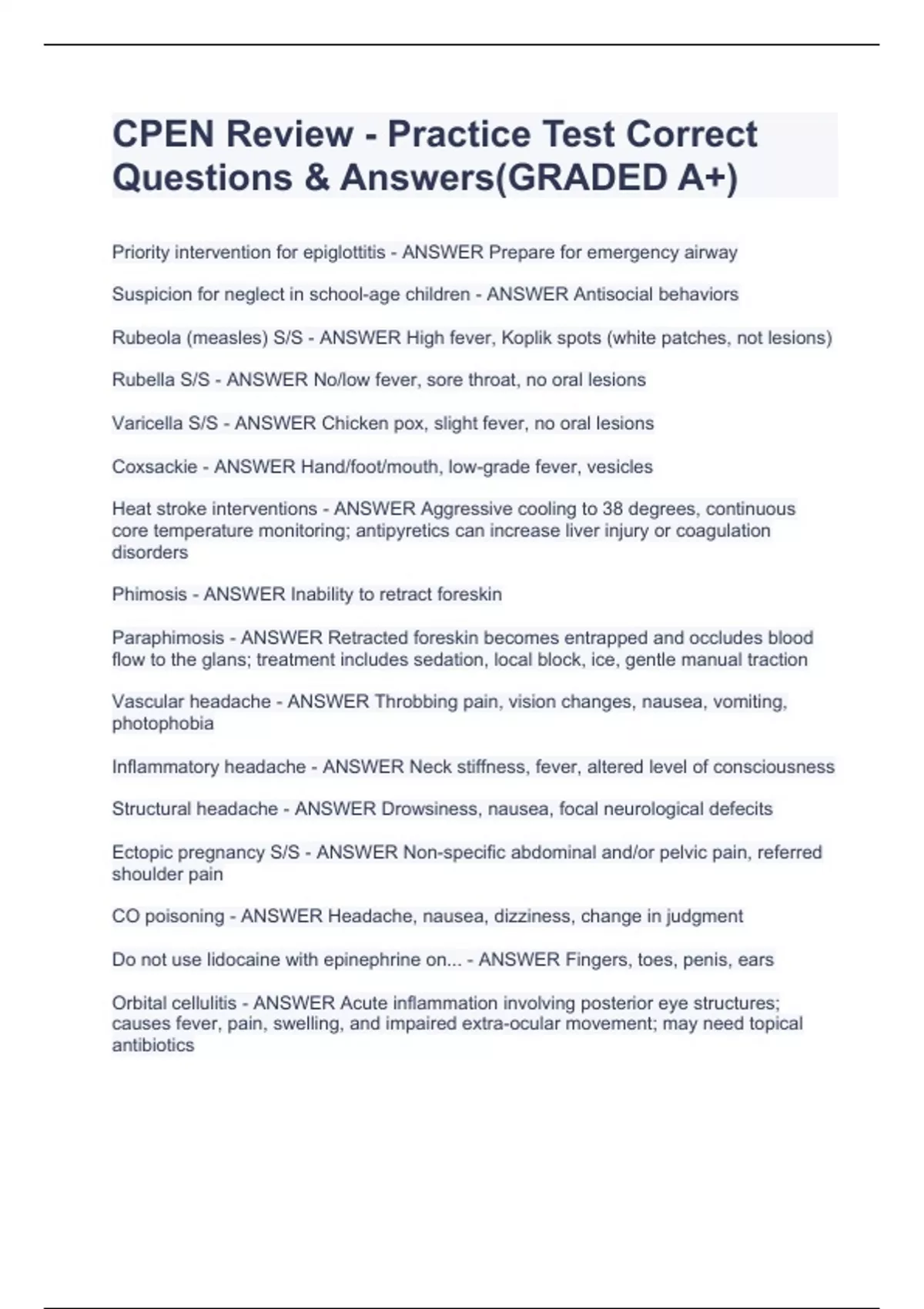Priority intervention for epiglottitis - ANSWER Prepare for emergency airway Suspicion for neglect in school-age children - ANSWER Antisocial behaviors Rubeola (measles) S/S - ANSWER High fever, Koplik spots (white patches, not lesions) Rubella S/S - ANSWER No/low fever, sore throat, no oral lesions Varicella S/S - ANSWER Chicken pox, slight fever, no oral lesions Coxsackie - ANSWER Hand/foot/mouth, low-grade fever, vesicles Heat stroke interventions - ANSWER Aggressive cooling to 38 degrees, continuous core temperature monitoring; antipyretics can increase liver injury or coagulation disorders Phimosis - ANSWER Inability to retract foreskin Paraphimosis - ANSWER Retracted foreskin becomes entrapped and occludes blood flow to the glans; treatment includes sedation, local block, ice, gentle manual traction Vascular headache - ANSWER Throbbing pain, vision changes, nausea, vomiting, photophobia Inflammatory headache - ANSWER Neck stiffness, fever, altered level of consciousness Structural headache - ANSWER Drowsiness, nausea, focal neurological defecits Ectopic pregnancy S/S - ANSWER Non-specific abdominal and/or pelvic pain, referred shoulder pain CO poisoning - ANSWER Headache, nausea, dizziness, change in judgment Do not use lidocaine with epinephrine on... - ANSWER Fingers, toes, penis, ears Orbital cellulitis - ANSWER Acute inflammation involving posterior eye structures; causes fever, pain, swelling, and impaired extra-ocular movement; may need topical antibiotics Periorbital cellulitis - ANSWER Acute inflammation involving eyelid; may need topical antibiotics Larynx fracture - ANSWER Shortness of breath, bruising, abrasions, swelling, subcutaneous emphysema; main causes are MVA, strangulation, and trauma; need airway Pediatric assessment triangle - ANSWER Appearance, work of breathing, circulation Tracheomalacia - ANSWER Stridor at rest is normal; non-infectious Spinal cord compression - ANSWER Back pain in children caused by tumor; causes weakness and numbness of legs, incontinence Malrotation volvulus S/S - ANSWER Bilious vomiting, distended abdomen