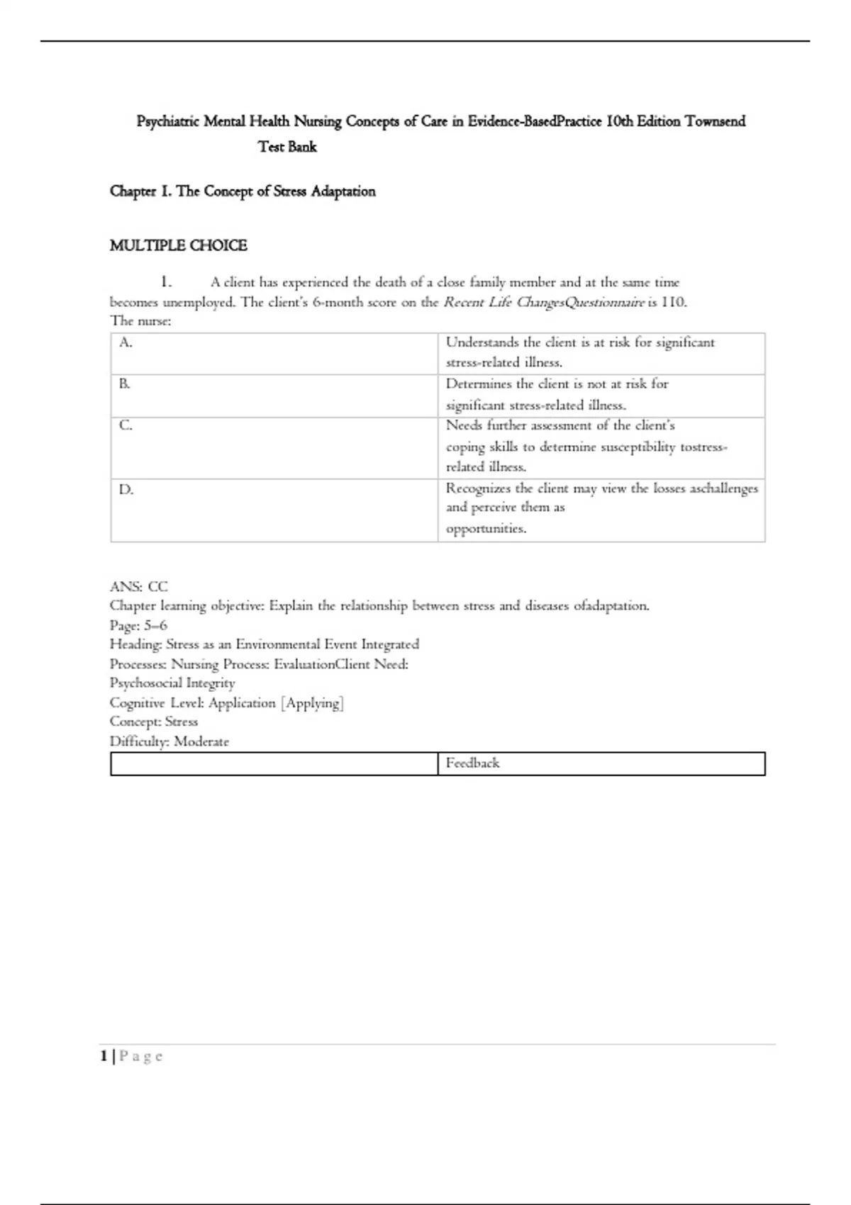Test Bank Psychiatric Mental Health Nursing Concepts of Care in Evidence-BasedPractice 10th Edition TownsendChapter 1. The Concept of Stress Adaptation MULTIPLE CHOICE 1. A client has experienced the death of a close family member and at the same time becomes unemployed. The client’s 6-month score on the Recent Life Changes Questionnaire is 110. The nurse: A. Understands the client is at risk for significant stress-related illness. B. C. D. Determines the client is not at risk for significant stress-related illness. Needs further assessment of the client’s coping skills to determine susceptibility to stressrelated illness. Recognizes the client may view the losses as challenges and perceive them as opportunities. ANS: C C Chapter learning objective: Explain the relationship between stress and diseases of adaptation. Page: 5–6 Heading: Stress as an Environmental Event Integrated Processes: Nursing Process: Evaluation Client Need: Psychosocial Integrity Cognitive Level: Application [Applying] Concept: Stress Difficulty: Moderate Feedback 1 | P a g eA This is incorrect. Assessment is the first step of the nursing process. The nurse should assess the client’s coping skills and available support before determining susceptibility to stress-related physical and psychological illness. The Recent Life Changes Questionnaire is an expanded version of the Schedule of Recent Experiences and the Rahe- Holmes Social Readjustment Rating Scale. A 6-month score of 300 or more, or a year-score total of 500 or more, indicates high stress in a client’s life and susceptibility to stress-related illnesses. B This is incorrect. Assessment is the first step in the nursing process. The nurse should assess the client’s coping skills and available support before determining the client’s perception of the current stresses. A 6-month score of 300 or a year-score of 500 or more on the Recent Life Changes Questionnaire indicates high stress in a client’s life and susceptibility to stress-related physical and psychological illness. C This is correct. Assessment is the first step in the nursing process. The nurse should assess the client’s coping skills and available support before determining susceptibility to stress- related physical and psychological illness. A 6-month score of 300 or a year-score of 500 or more indicates high stress in a client’s life and risk for significant stress-related physical and psychological illness. D This is incorrect. Assessment is the first step in the nursing process. The nurse should assess the client’s coping skills and available support before determining susceptibility to stress-related illness. A 6-month score of 300 or a year-score of 500 or more on the Recent Life Changes Questionnaire indicates high stress in a client’s life is susceptible to significant stress-related physical and psychological illness. PTS: 1 CON: Stress 2 | P a g e2. A physically and emotionally healthy client has just been fired. During a routine office visit, he tells the nurse, “Perhaps this was the best thing to happen. Maybe I’ll consider pursuing an art degree.” The nurse determines the client perceives the stressor of his job loss as: A. Irrelevant. B. C. D. Harm/loss. A threat. A challenge. ANS: D Chapter: Chapter 0, The Concept of Stress Adaptation Chapter learning objective: Discuss adaptive coping strategies in the management of stress. Page: 7 Heading: Individual’s Perception of the Event > Primary Appraisal Integrated Processes: Nursing Process: Assessment Client Need: Psychosocial Integrity Cognitive Level: Application [Applying] Concept: Stress Difficulty: Easy Feedback A B C D This is incorrect. The client’s statement indicates he perceives the loss of his job as a challenge and an opportunity for growth. This is incorrect. The client’s statement indicates he perceives the loss of his job as a challenge and an opportunity for growth. This is incorrect. The client’s statement indicates he perceives the loss of his job as a challenge and an opportunity for growth. This is correct. The client’s statement indicates he perceives the loss of his job as a challenge and an opportunity for growth. PTS: 1 3. maladaptively to stress? A. CON: Stress Which client statement alerts the nurse that the client may be responding “Avoiding contact with others helps me cope.” 3 | P a g eB. “I really enjoy journaling; it’s my private time.” C. D. “I signed up for a yoga class this week.” “I made an appointment to meet with a therapist.” ANS: A Chapter: Chapter 0, The Concept of Stress Adaptation Chapter learning objective: Discuss adaptive coping strategies in the management of stress. Page: 8–9 Heading: Stress Management Integrated Processes: Nursing Process: Evaluation Client Need: Psychosocial Integrity Cognitive Level: Application [Applying] Concept: Stress Difficulty: Easy Feedback A This is correct. Reliance on social isolation as a coping mechanism is a maladaptive method to relieve stress. It can prevent learning appropriate coping skills and can prevent access to needed support systems. B C D This is incorrect. Journaling is not considered a maladaptive coping method. This is incorrect. Group exercise is not considered a maladaptive coping method. This is incorrect. Seeing a therapist is not considered a maladaptive coping method. PTS: 1 4. CON: Stress A nursing student comes down with a sinus infection toward the end of every semester. Which stage of stress is the student most likely experiencing when this occurs? A. Alarm reaction B. C. D. ANS: C Chapter: Chapter 0, The Concept of Stress Adaptation Chapter learning objective: Explain the relationship between stress and diseases of adaptation. Page: 9 Heading: Stress as a Biological Response > Stage of Exhaustion Integrated 4 | P a g e Resistance Exhaustion Fight or flightProcesses: Nursing Process: Assessment Client Need: Psychosocial Integrity Cognitive Level: Comprehension [Understanding] Conc