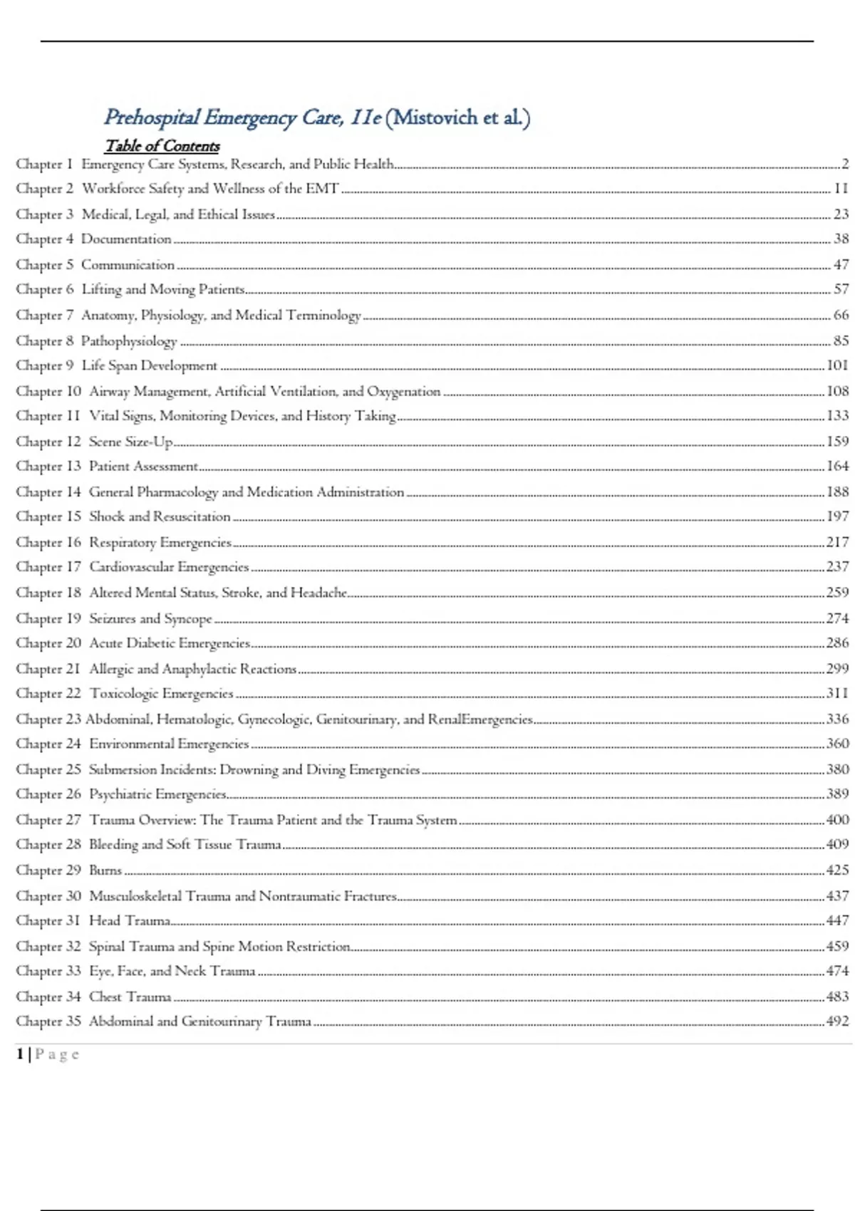 TEST BANK PREHOSPITAL EMERGENCY CARE JOSEPH J. MISTOVICH, KEITH J. KARREN, BRENT HAFENTable of Contents Chapter 1 Emergency Care Systems, Research, and Public Health ................................................................................................................................................ 2 Chapter 2 Workforce Safety and Wellness of the EMT .............................................................................................................................................................. 11 Chapter 3 Medical, Legal, and Ethical Issues ................................................................................................................................................................................... 23 Chapter 4 Documentation .................................................................................................................................................................................................................... 38 Chapter 5 Communication ................................................................................................................................................................................................................... 47 Chapter 6 Lifting and Moving Patients ............................................................................................................................................................................................. 57 Chapter 7 Anatomy, Physiology, and Medical Terminology ....................................................................................................................................................... 66 Chapter 8 Pathophysiology .................................................................................................................................................................................................................. 85 Chapter 9 Life Span Development ................................................................................................................................................................................................... 101 Chapter 10 Airway Management, Artificial Ventilation, and Oxygenation ........................................................................................................................... 108 Chapter 11 Vital Signs, Monitoring Devices, and History Taking .......................................................................................................................................... 133 Chapter 12 Scene Size-Up .................................................................................................................................................................................................................. 159 Chapter 13 Patient Assessment .......................................................................................................................................................................................................... 164 Chapter 14 General Pharmacology and Medication Administration ....................................................................................................................................... 188 Chapter 15 Shock and Resuscitation ............................................................................................................................................................................................... 197 Chapter 16 Respiratory Emergencies ............................................................................................................................................................................................... 217 Chapter 17 Cardiovascular Emergencies ......................................................................................................................................................................................... 237 Chapter 18 Altered Mental Status, Stroke, and Headache .......................................................................................................................................................... 259 Chapter 19 Seizures and Syncope ..................................................................................................................................................................................................... 274 Chapter 20 Acute Diabetic Emergencies ......................................................................................................................................................................................... 286 Chapter 21 Allergic and Anaphylactic Reactions .......................................................................................................................................................................... 299 Chapter 22 Toxicologic Emergencies .............................................................................................................................................................................................. 311 Chapter 23 Abdominal, Hematologic, Gynecologic, Genitourinary, and Renal Emergencies .............................................................................................. 336 Chapter 24 Environmental Emergencies ......................................................................................................................................................................................... 360 Chapter 25 Submersion Incidents: Drowning and Diving Emergencies .................................................................................................................................. 380 Chapter 26 Psychiatric Emergencies................................................................................................................................................................................................. 389 Chapter 27 Trauma Overview: The Trauma Patient and the Trauma System .........................................