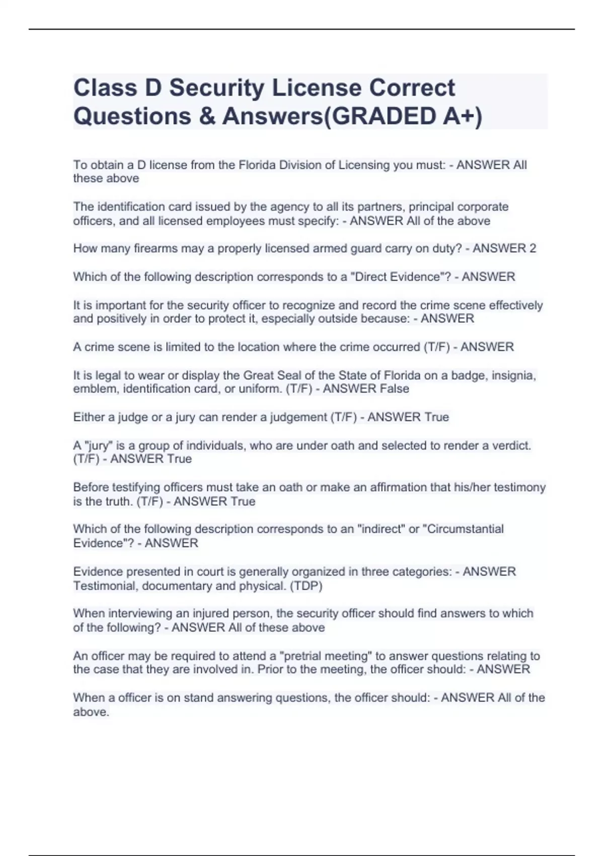 To obtain a D license from the Florida Division of Licensing you must: - ANSWER All these above The identification card issued by the agency to all its partners, principal corporate officers, and all licensed employees must specify: - ANSWER All of the above How many firearms may a properly licensed armed guard carry on duty? - ANSWER 2 Which of the following description corresponds to a "Direct Evidence"? - ANSWER It is important for the security officer to recognize and record the crime scene effectively and positively in order to protect it, especially outside because: - ANSWER A crime scene is limited to the location where the crime occurred (T/F) - ANSWER It is legal to wear or display the Great Seal of the State of Florida on a badge, insignia, emblem, identification card, or uniform. (T/F) - ANSWER False Either a judge or a jury can render a judgement (T/F) - ANSWER True A "jury" is a group of individuals, who are under oath and selected to render a verdict. (T/F) - ANSWER True Before testifying officers must take an oath or make an affirmation that his/her testimony is the truth. (T/F) - ANSWER True Which of the following description corresponds to an "indirect" or "Circumstantial Evidence"? - ANSWER Evidence presented in court is generally organized in three categories: - ANSWER Testimonial, documentary and physical. (TDP) When interviewing an injured person, the security officer should find answers to which of the following? - ANSWER All of these above An officer may be required to attend a "pretrial meeting" to answer questions relating to the case that they are involved in. Prior to the meeting, the officer should: - ANSWER When a officer is on stand answering questions, the officer should: - ANSWER All of the above. "Simple Assault" is legally defined as - ANSWER