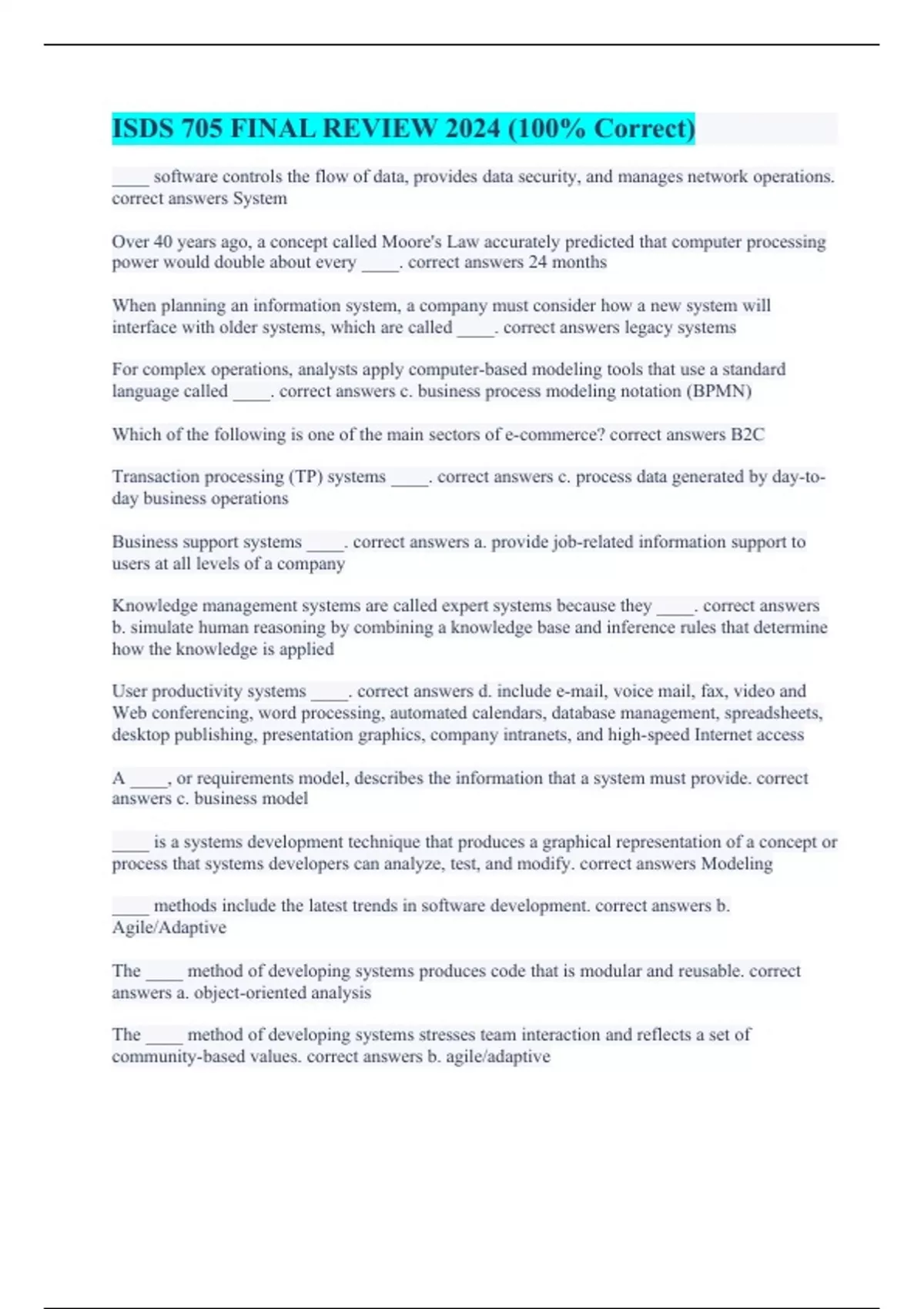 ____ software controls the flow of data, provides data security, and manages network operations. correct answers System Over 40 years ago, a concept called Moore's Law accurately predicted that computer processing power would double about every ____. correct answers 24 months When planning an information system, a company must consider how a new system will interface with older systems, which are called ____. correct answers legacy systems For complex operations, analysts apply computer-based modeling tools that use a standard language called ____. correct answers c. business process modeling notation (BPMN) Which of the following is one of the main sectors of e-commerce? correct answers B2C Transaction processing (TP) systems ____. correct answers c. process data generated by day-to-day business operations Business support systems ____. correct answers a. provide job-related information support to users at all levels of a company Knowledge management systems are called expert systems because they ____. correct answers b. simulate human reasoning by combining a knowledge base and inference rules that determine how the knowledge is applied User productivity systems ____. correct answers d. include e-mail, voice mail, fax, video and Web conferencing, word processing, automated calendars, database management, spreadsheets, desktop publishing, presentation graphics, company intranets, and high-speed Internet access A ____, or requirements model, describes the information that a system must provide. correct answers c. business model ____ is a systems development technique that produces a graphical representation of a concept or process that systems developers can analyze, test, and modify. correct answers Modeling ____ methods include the latest trends in software development. correct answers b. Agile/Adaptive The ____ method of developing systems produces code that is modular and reusable. correct answers a. object-oriented analysis The ____ method of developing systems stresses team interaction and reflects a set of community-based values. correct answers b. agile/adaptive