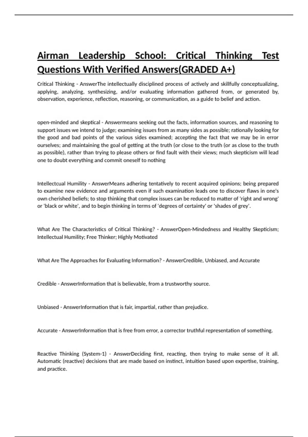 Airman Leadership School: Critical Thinking Test Questions With Verified Answers(GRADED A+)Airman Leadership School: Critical Thinking Test Questions With Verified Answers(GRADED A+)Airman Leadership School: Critical Thinking Test Questions With Verified Answers(GRADED A+)Airman Leadership School: Critical Thinking Test Questions With Verified Answers(GRADED A+)Airman Leadership School: Critical Thinking Test Questions With Verified Answers(GRADED A+)Airman Leadership School: Critical Thinking Test Questions With Verified Answers(GRADED A+)Airman Leadership School: Critical Thinking Test Questions With Verified Answers(GRADED A+)Airman Leadership School: Critical Thinking Test Questions With Verified Answers(GRADED A+)Airman Leadership School: Critical Thinking Test Questions With Verified Answers(GRADED A+)Airman Leadership School: Critical Thinking Test Questions With Verified Answers(GRADED A+)Airman Leadership School: Critical Thinking Test Questions With Verified Answers(GRADED A+)Airman Leadership School: Critical Thinking Test Questions With Verified Answers(GRADED A+)Airman Leadership School: Critical Thinking Test Questions With Verified Answers(GRADED A+)Airman Leadership School: Critical Thinking Test Questions With Verified Answers(GRADED A+)