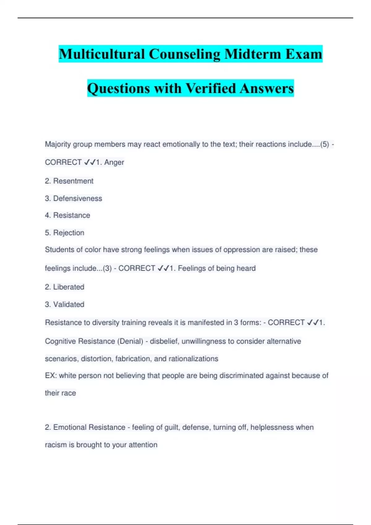 Multicultural Counseling Midterm Exam Questions with Verified Answers Majority group members may react emotionally to the text; their reactions include....(5) - CORRECT ️️ 1. Anger 2. Resentment 3. Defensiveness 4. Resistance 5. Rejection Students of color have strong feelings when issues of oppression are raised; these feelings include...(3) - CORRECT ️️ 1. Feelings of being heard 2. Liberated 3. Validated Resistance to diversity training reveals it is manifested in 3 forms: - CORRECT ️️ 1. Cognitive Resistance (Denial) - disbelief, unwillingness to consider alternative scenarios, distortion, fabrication, and rationalizations EX: white person not believing that people are being discriminated against because of their race 2. Emotional Resistance - feeling of guilt, defense, turning off, helplessness when racism is brought to your attention 3. Behavioral Resistance - resistance that entails paralysis or inaction in the presence of discrimination from majority group individuals When counseling the culturally diverse, counselors should...(3) - CORRECT ️️ 1. Be open to lower personal defenses 2. Be able to recognize human condition 3. Be able to recognize spiritual and emotional domains in others Etic - CORRECT ️️ AKA: Cultural Universality Belief that human beings share overwhelming commonalities. Belief that manifestation and treatment of disorders are similar across all cultures Emic - CORRECT ️️ AKA: Cultural Relativism Belief that cultural differences must be considered in the diagnosis and treatment of culturally diverse groups. Worldview - CORRECT ️️ Composed of people's attitudes, values, and beliefs that affect how people think, define events, make decisions, and behave Culture Bound Syndromes - CORRECT ️️ Mental disorders unique to various culture