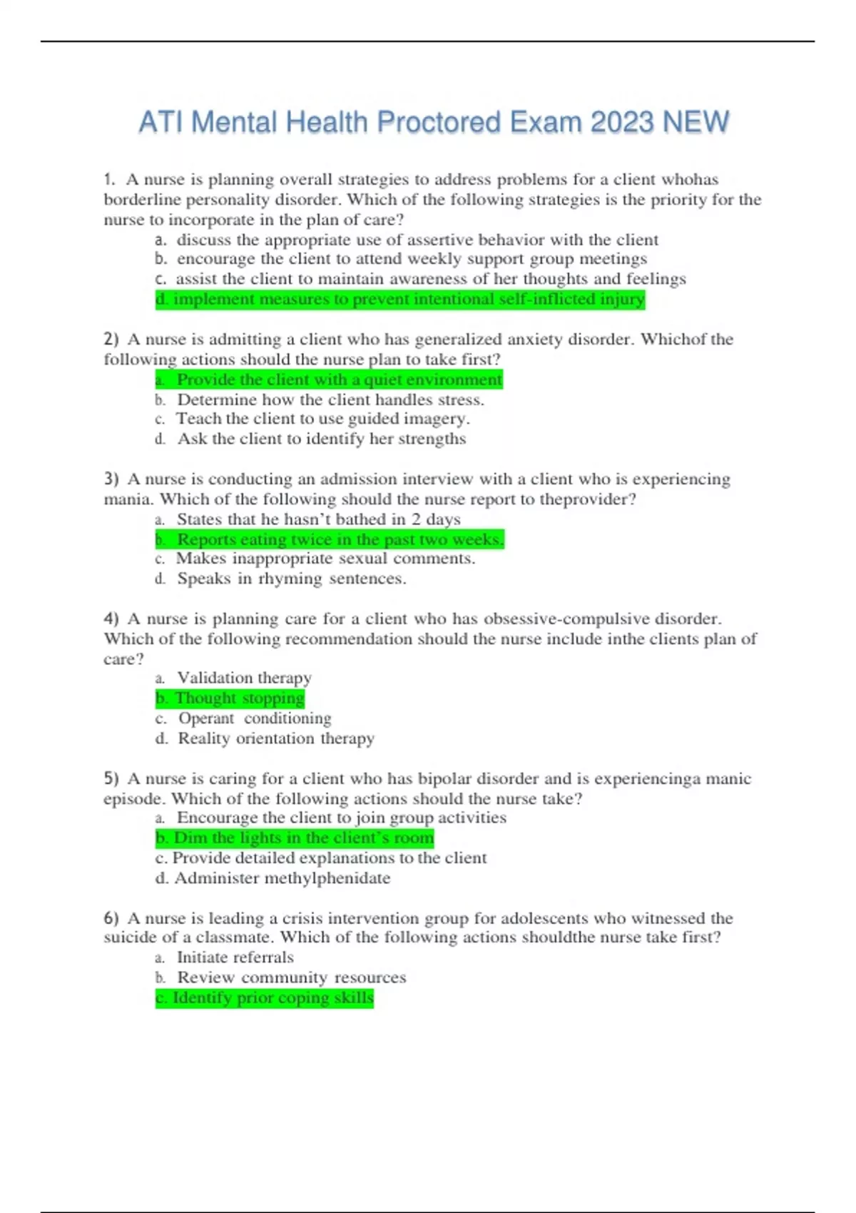 ***Download Test Bank Immediately After the Purchase. Just in case you have trouble downloading, kindly message me, and I will send it to you via Google Doc or email. Thank you*** Looking for a comprehensive test bank to ace the (NGN) ATI MENTAL HEALTH PROCTORED EXam? Look no further! Our ATI Mental Health Test Bank is the ultimate resource to help you succeed. This test bank is specifically designed to provide you with a wealth of practice questions, verified answers, and detailed rationales to reinforce your knowledge and boost your confidence. With our NGN Proctored Exam Questions, you'll have access to a wide range of topics covered in the ATI Mental Health exam. Our review materials offer an in-depth understanding of crucial concepts and ensure that you're well-prepared for the actual exam. Whether you're looking for ATI Mental Health Study Guides, practice tests, or exam prep resources, we've got you covered. By using our NGN Exam Practice Questions, you can familiarize yourself with the format and structure of the ATI MENTAL HEALTH PROCTORED EXam. Stay ahead of the competition with our comprehensive ATI Mental Health Review Materials and enhance your chances of achieving a top score. Don't miss out on this invaluable tool for success. Boost your exam readiness today with our NGN Proctored Exam Resources and unlock your true potential.