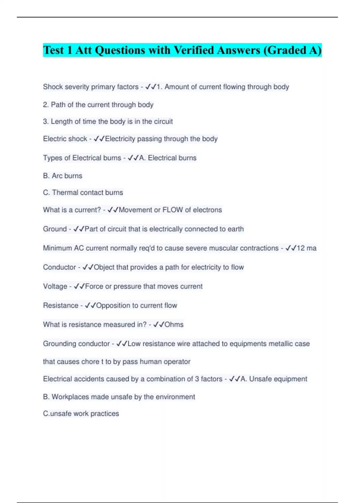 Test 1 Att Questions with Verified Answers (Graded A) Shock severity primary factors - ️️ 1. Amount of current flowing through body 2. Path of the current through body 3. Length of time the body is in the circuit Electric shock - ️️ Electricity passing through the body Types of Electrical burns - ️️ A. Electrical burns B. Arc burns C. Thermal contact burns What is a current? - ️️ Movement or FLOW of electrons Ground - ️️ Part of circuit that is electrically connected to earth Minimum AC current normally req'd to cause severe muscular contractions - ️️ 12 ma Conductor - ️️ Object that provides a path for electricity to flow Voltage - ️️ Force or pressure that moves current Resistance - ️️ Opposition to current flow What is resistance measured in? - ️️ Ohms