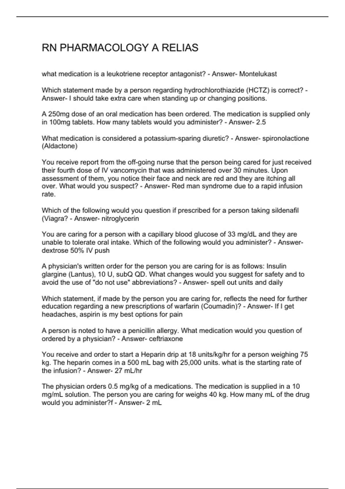 what medication is a leukotriene receptor antagonist? - Answer- Montelukast Which statement made by a person regarding hydrochlorothiazide (HCTZ) is correct? - Answer- I should take extra care when standing up or changing positions. A 250mg dose of an oral medication has been ordered. The medication is supplied only in 100mg tablets. How many tablets would you administer? - Answer- 2.5 What medication is considered a potassium-sparing diuretic? - Answer- spironolactione (Aldactone) You receive report from the off-going nurse that the person being cared for just received their fourth dose of IV vancomycin that was administered over 30 minutes. Upon assessment of them, you notice their face and neck are red and they are itching all over. What would you suspect? - Answer- Red man syndrome due to a rapid infusion rate. Which of the following would you question if prescribed for a person taking sildenafil (Viagra? - Answer- nitroglycerin You are caring for a person with a capillary blood glucose of 33 mg/dL and they are unable to tolerate oral intake. Which of the following would you administer? - Answer- dextrose 50% IV push A physician's written order for the person you are caring for is as follows: Insulin glargine (Lantus), 10 U, subQ QD. What changes would you suggest for safety and to avoid the use of "do not use" abbreviations? - Answer- spell out units and daily Which statement, if made by the person you are caring for, reflects the need for further education regarding a new prescriptions of warfarin (Coumadin)? - Answer- If I get headaches, aspirin is my best options for pain A person is noted to have a penicillin allergy. What medication would you question of ordered by a physician? - Answer- ceftriaxone You receive and order to start a Heparin drip at 18 units/kg/hr for a person weighing 75 kg. The heparin comes in a 500 mL bag with 25,000 units. what is the starting rate of the infusion? - Answer- 27 mL/hr The physician orders 0.5 mg/kg of a medications. The medication is supplied in a 10 mg/mL solution. The person you are caring for weighs 40 kg. How many mL of the drug would you administer?f - Answer- 2 mL