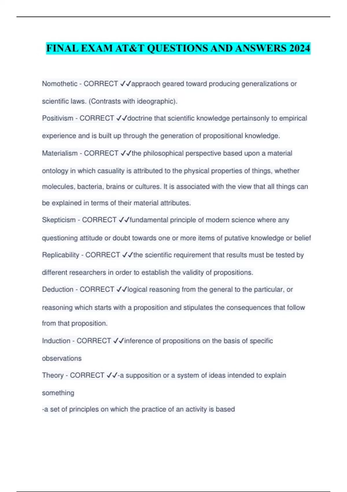 FINAL EXAM AT&T QUESTIONS AND ANSWERS 2024 Nomothetic - CORRECT ️️ appraoch geared toward producing generalizations or scientific laws. (Contrasts with ideographic). Positivism - CORRECT ️️ doctrine that scientific knowledge pertainsonly to empirical experience and is built up through the generation of propositional knowledge. Materialism - CORRECT ️️ the philosophical perspective based upon a material ontology in which casuality is attributed to the physical properties of things, whether molecules, bacteria, brains or cultures. It is associated with the view that all things can be explained in terms of their material attributes. Skepticism - CORRECT ️️ fundamental principle of modern science where any questioning attitude or doubt towards one or more items of putative knowledge or belief Replicability - CORRECT ️️ the scientific requirement that results must be tested by different researchers in order to establish the validity of propositions. Deduction - CORRECT ️️ logical reasoning from the general to the particular, or reasoning which starts with a proposition and stipulates the consequences that follow from that proposition. Induction - CORRECT ️️ inference of propositions on the basis of specific observations