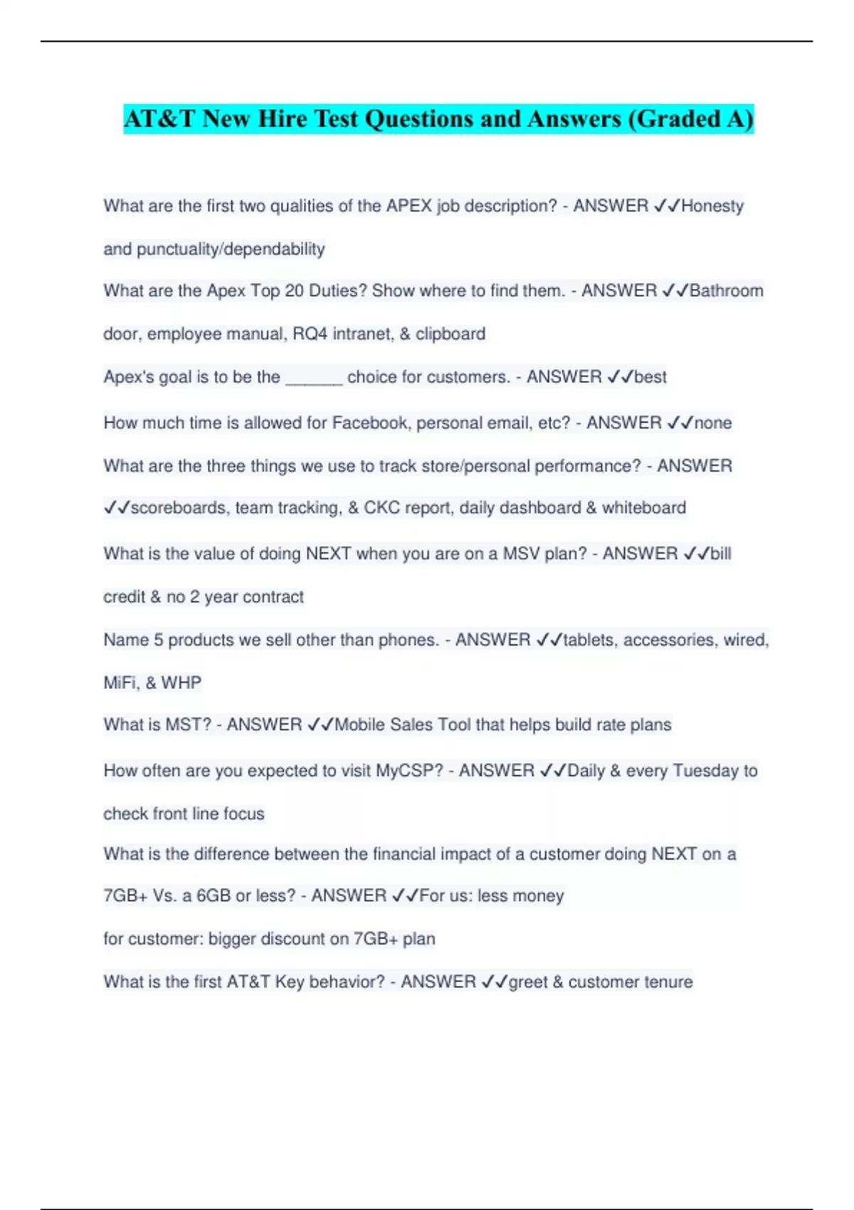 AT&T New Hire Test Questions and Answers (Graded A) What are the first two qualities of the APEX job description? - ANSWER ️️ Honesty and punctuality/dependability What are the Apex Top 20 Duties? Show where to find them. - ANSWER ️️ Bathroom door, employee manual, RQ4 intranet, & clipboard Apex's goal is to be the ______ choice for customers. - ANSWER ️️ best How much time is allowed for Facebook, personal email, etc? - ANSWER ️️ none What are the three things we use to track store/personal performance? - ANSWER ️️ scoreboards, team tracking, & CKC report, daily dashboard & whiteboard What is the value of doing NEXT when you are on a MSV plan? - ANSWER ️️ bill credit & no 2 year contract Name 5 products we sell other than phones. - ANSWER ️️ tablets, accessories, wired, MiFi, & WHP What is MST? - ANSWER ️️ Mobile Sales Tool that helps build rate plans How often are you expected to visit MyCSP? - ANSWER ️️ Daily & every Tuesday to check front line focus What is the difference between the financial impact of a customer doing NEXT on a 7GB+ Vs. a 6GB or less? - ANSWER ️️ For us: less money for customer: bigger discount on 7GB+ plan What is the first AT&T Key behavior? - ANSWER ️️ greet & customer tenure