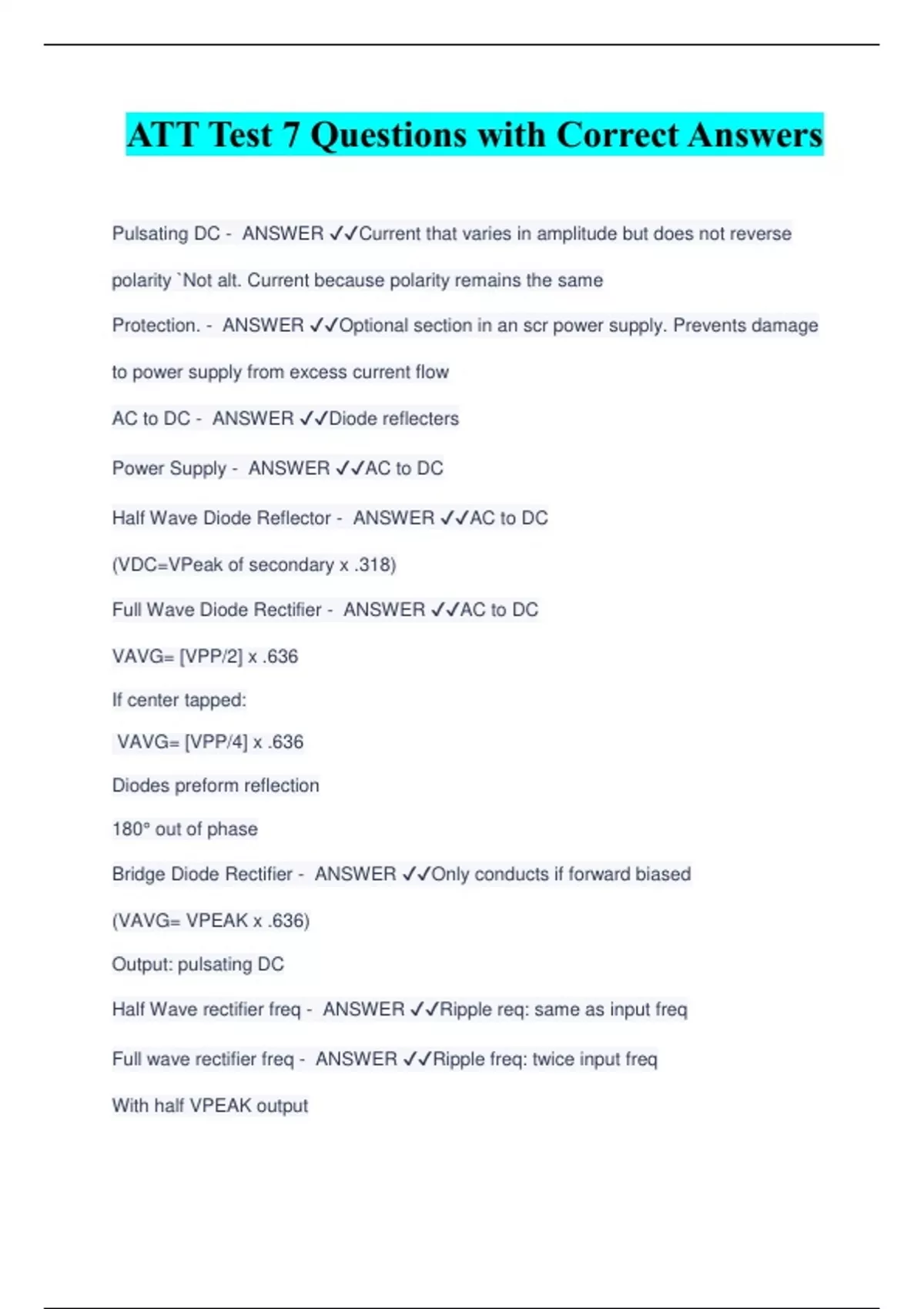 ATT Test 7 Questions with Correct Answers Pulsating DC - ANSWER ️️ Current that varies in amplitude but does not reverse polarity `Not alt. Current because polarity remains the same Protection. - ANSWER ️️ Optional section in an scr power supply. Prevents damage to power supply from excess current flow AC to DC - ANSWER ️️ Diode reflecters Power Supply - ANSWER ️️ AC to DC Half Wave Diode Reflector - ANSWER ️️ AC to DC (VDC=VPeak of secondary x .318) Full Wave Diode Rectifier - ANSWER ️️ AC to DC VAVG= [VPP/2] x .636 If center tapped: VAVG= [VPP/4] x .636 Diodes preform reflection 180° out of phase Bridge Diode Rectifier - ANSWER ️️ Only conducts if forward biased (VAVG= VPEAK x .636) Output: pulsating DC Half Wave rectifier freq - ANSWER ️️ Ripple req: same as input freq Full wave rectifier freq - ANSWER ️️ Ripple freq: twice input freq With half VPEAK output