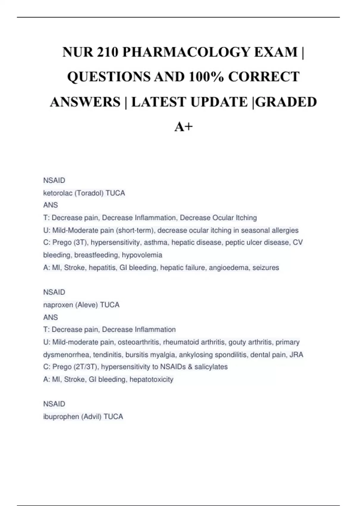 NSAID ketorolac (Toradol) TUCA ANS T: Decrease pain, Decrease Inflammation, Decrease Ocular Itching U: Mild-Moderate pain (short-term), decrease ocular itching in seasonal allergies C: Prego (3T), hypersensitivity, asthma, hepatic disease, peptic ulcer disease, CV bleeding, breastfeeding, hypovolemia A: MI, Stroke, hepatitis, GI bleeding, hepatic failure, angioedema, seizures NSAID naproxen (Aleve) TUCA ANS T: Decrease pain, Decrease Inflammation U: Mild-moderate pain, osteoarthritis, rheumatoid arthritis, gouty arthritis, primary dysmenorrhea, tendinitis, bursitis myalgia, ankylosing spondilitis, dental pain, JRA C: Prego (2T/3T), hypersensitivity to NSAIDs & salicylates A: MI, Stroke, GI bleeding, hepatotoxicity NSAID ibuprophen (Advil) TUCA