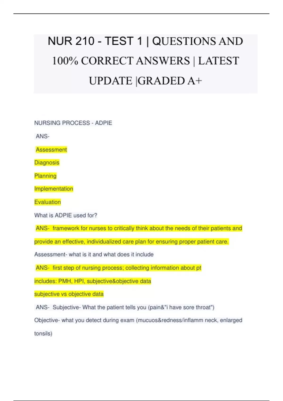 NURSING PROCESS - ADPIE ANSAssessment Diagnosis Planning Implementation Evaluation What is ADPIE used for? ANS- framework for nurses to critically think about the needs of their patients and provide an effective, individualized care plan for ensuring proper patient care. Assessment- what is it and what does it include ANS- first step of nursing process; collecting information about pt includes: PMH, HPI, subjective&objective data subjective vs objective data ANS- Subjective- What the patient tells you (pain&"i have sore throat") Objective- what you detect during exam (mucuos&redness/inflamm neck, enlarged tonsils)