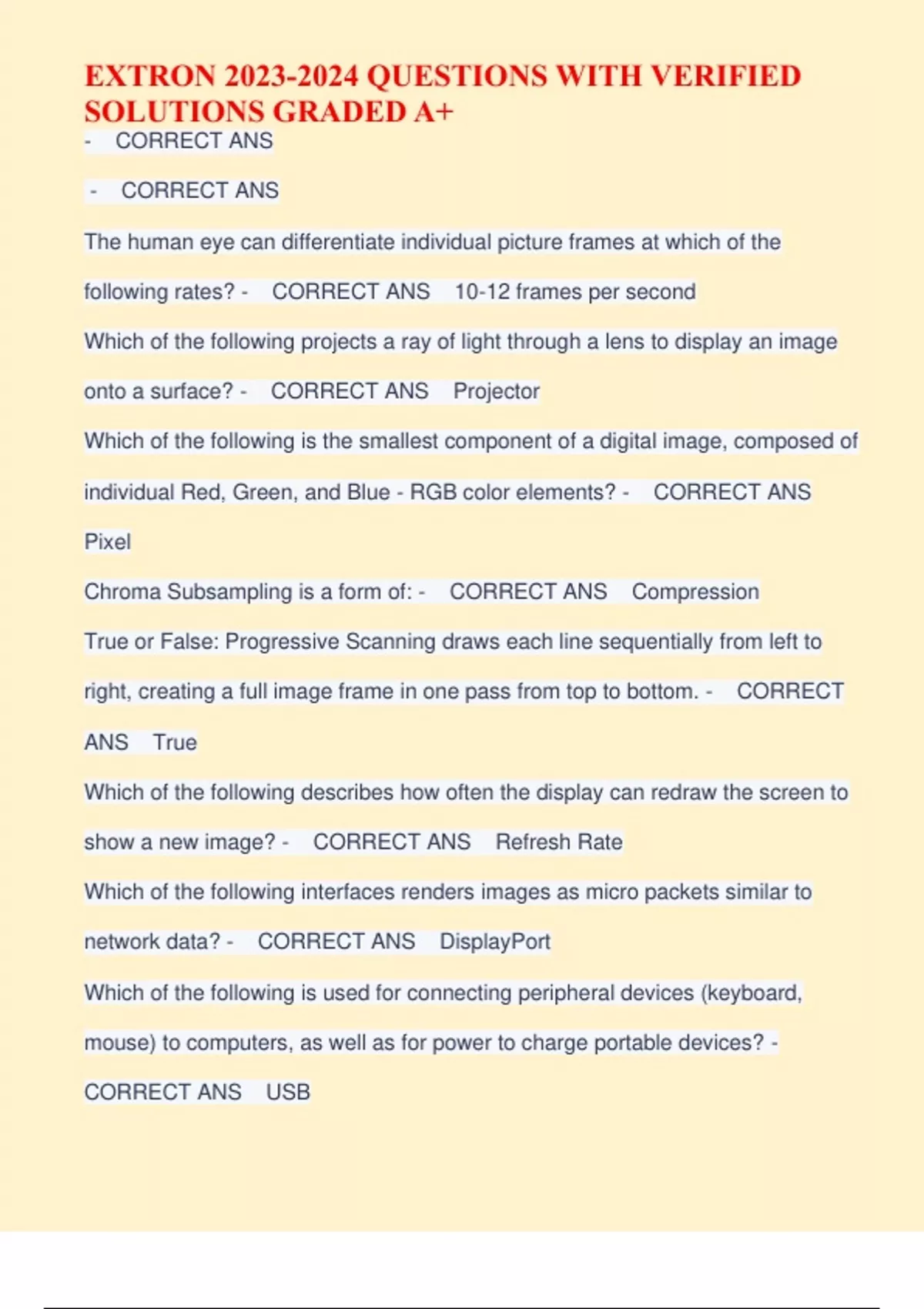 The human eye can differentiate individual picture frames at which of the following rates? - CORRECT ANS 10-12 frames per second Which of the following projects a ray of light through a lens to display an image onto a surface? - CORRECT ANS Projector Which of the following is the smallest component of a digital image, composed of individual Red, Green, and Blue - RGB color elements? - CORRECT ANS Pixel Chroma Subsampling is a form of: - CORRECT ANS Compression True or False: Progressive Scanning draws each line sequentially from left to right, creating a full image frame in one pass from top to bottom. - CORRECT ANS True Which of the following describes how often the display can redraw the screen to show a new image? - CORRECT ANS Refresh Rate Which of the following interfaces renders images as micro packets similar to network data? - CORRECT ANS DisplayPort Which of the following is used for connecting peripheral devices (keyboard, mouse) to computers, as well as for power to charge portable devices? - CORRECT ANS USB