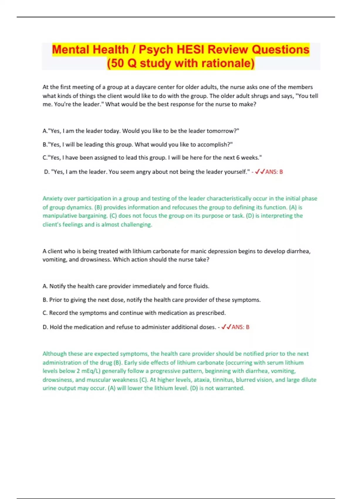 Mental Health / Psych HESI Review Questions (50 Q study with rationale)