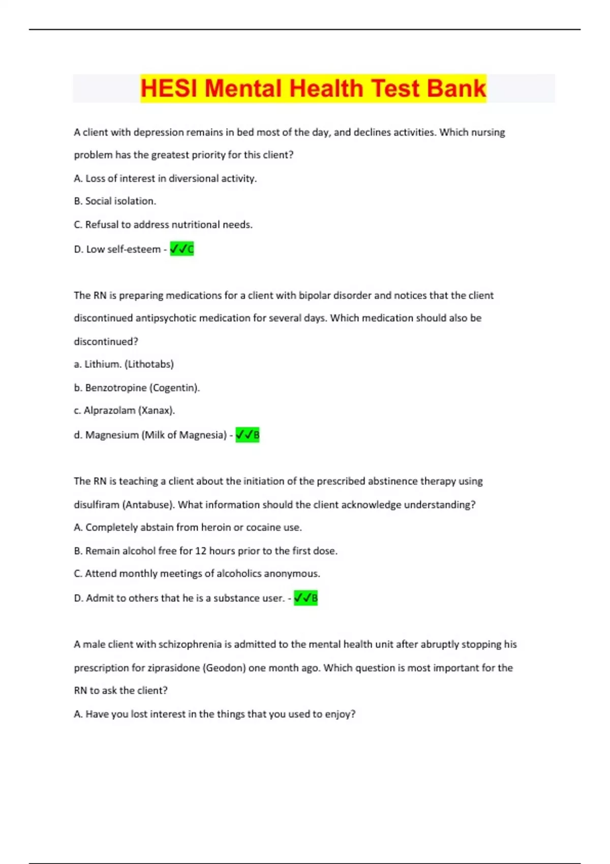 HESI Mental Health Test Bank Questions and answers, 100% Accurate, rated A+