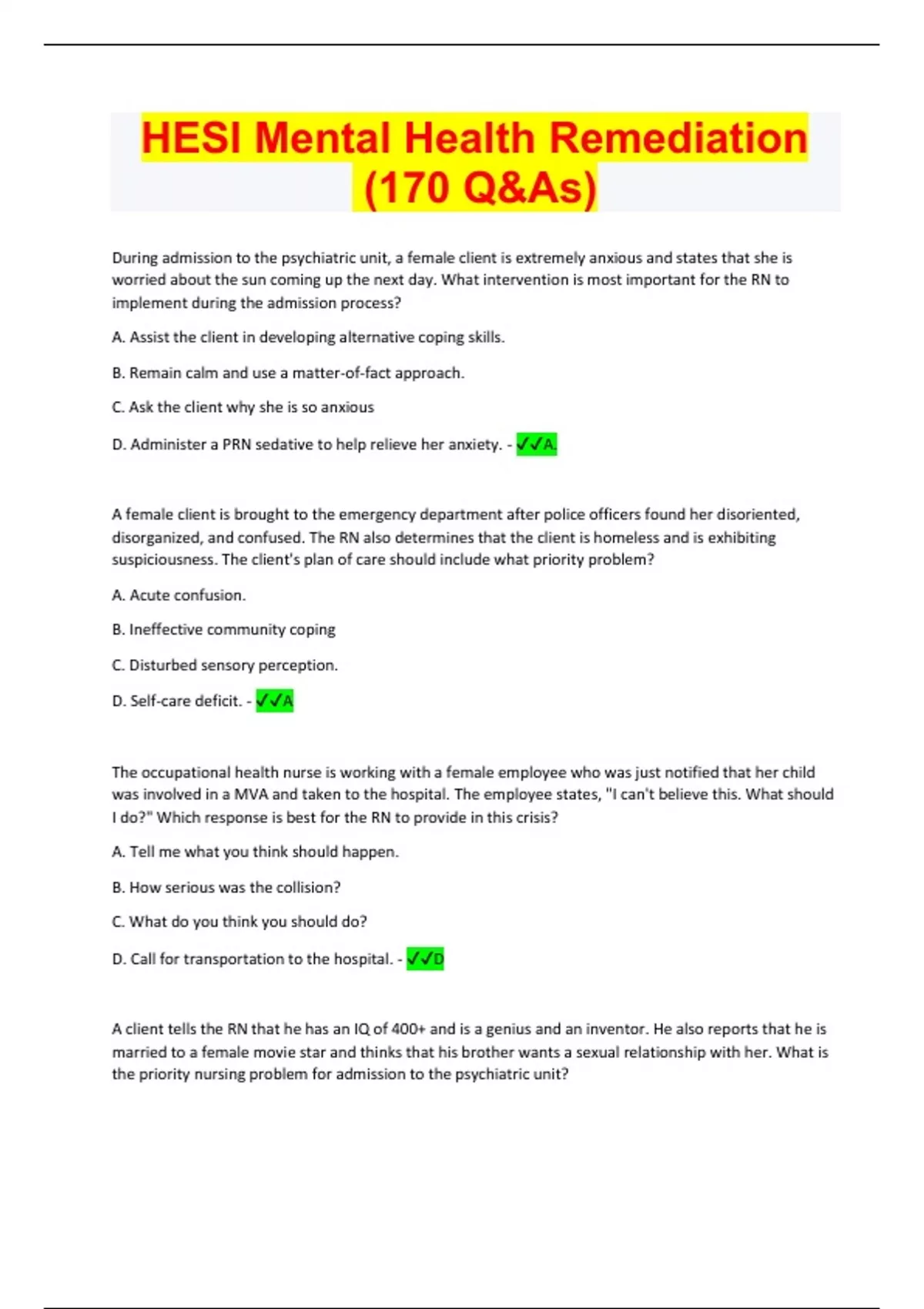 HESI Mental Health Remediation (170 Q&As) Questions and answers, 100% Accurate, rated A+
