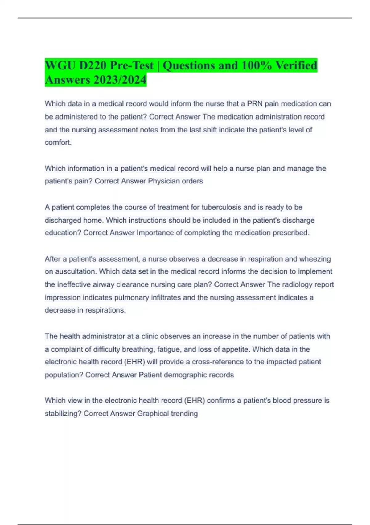 WGU D220 Pre-Test | Questions and 100% Verified Answers 2023/2024 Which data in a medical record would inform the nurse that a PRN pain medication can be administered to the patient? Correct Answer The medication administration record and the nursing assessment notes from the last shift indicate the patient's level of comfort. Which information in a patient's medical record will help a nurse plan and manage the patient's pain? Correct Answer Physician orders A patient completes the course of treatment for tuberculosis and is ready to be discharged home. Which instructions should be included in the patient's discharge education? Correct Answer Importance of completing the medication prescribed. After a patient's assessment, a nurse observes a decrease in respiration and wheezing on auscultation. Which data set in the medical record informs the decision to implement the ineffective airway clearance nursing care plan? Correct Answer The radiology report impression indicates pulmonary infiltrates and the nursing assessment indicates a decrease in respirations. The health administrator at a clinic observes an increase in the number of patients with a complaint of difficulty breathing, fatigue, and loss of appetite. Which data in the electronic health record (EHR) will provide a cross-reference to the impacted patient population? Correct Answer Patient demographic records Which view in the electronic health record (EHR) confirms a patient's blood pressure is stabilizing? Correct Answer Graphical trending After a patient's initial assessment, a nurse observes an increase in edema, bilateral crackles, and persistent cough. Which data set in the medical record from the last shift informs the decision to implement the fluid volume overload care plan? Correct Answer Nursing flowsheet and intake and output record Which data set in the electronic health record (EHR) will assist in evaluating the number of positive influenza tests at a facility within the past year? Correct Answer Laboratory records Which patients are ideally positioned to fully engage in their care? Correct Answer Patients that are recovering well after a full night of sleep.