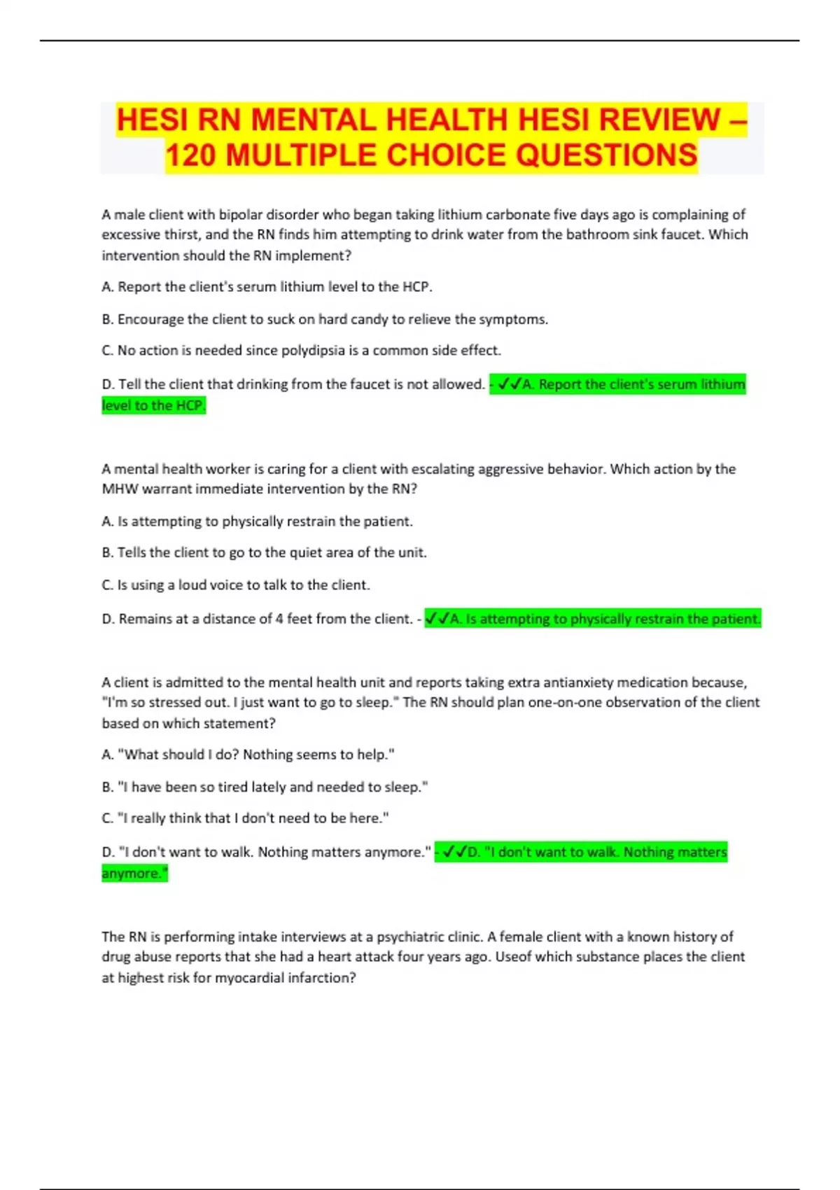 HESI RN MENTAL HEALTH HESI REVIEW – 120 MULTIPLE CHOICE Questions and answers, 100% Accurate, rated A+