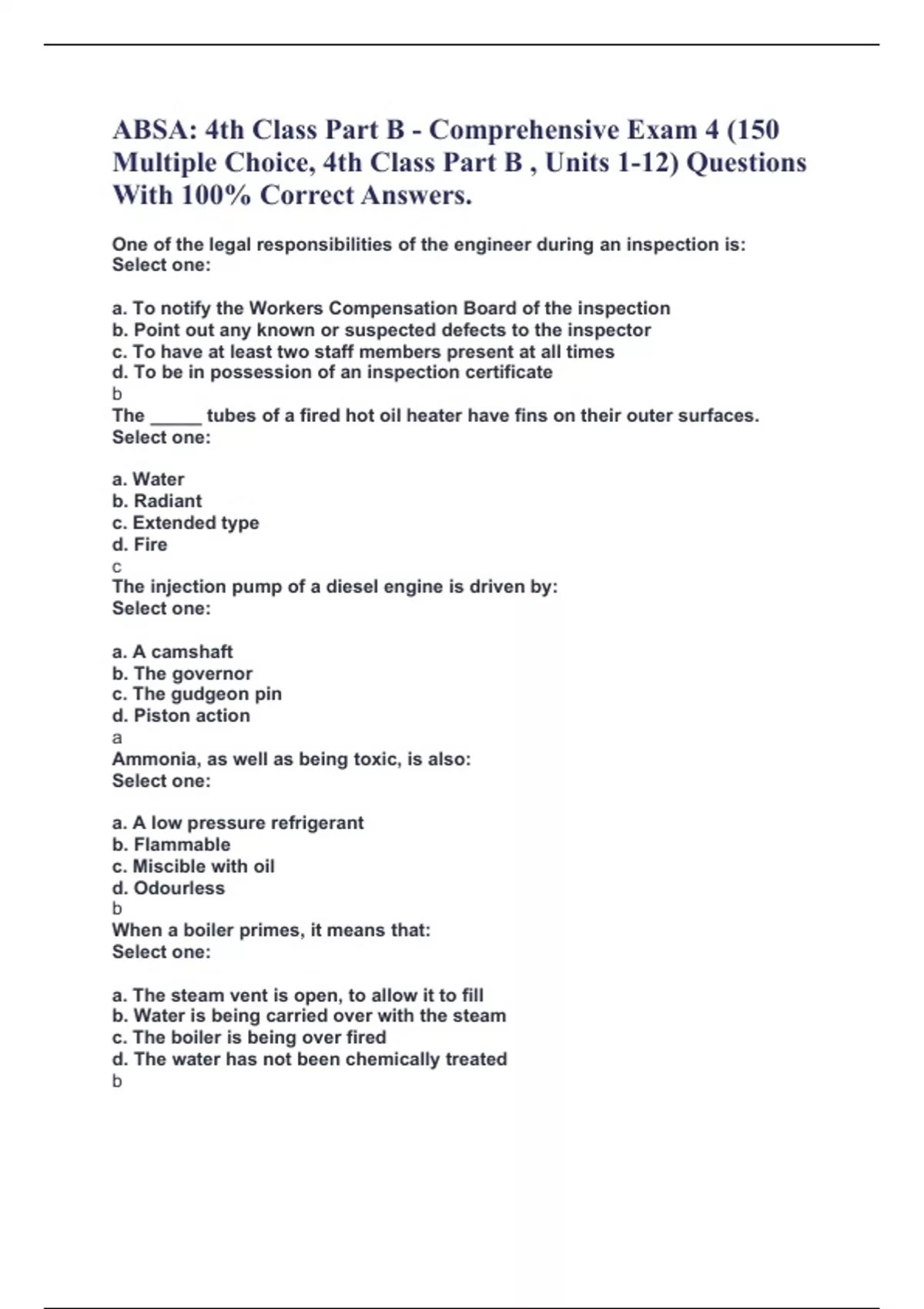 ABSA: 4th Class Part B - Comprehensive Exam 4 (150 Multiple Choice, 4th Class Part B , Units 1-12) Questions With 100% Correct Answers. One of the legal responsibilities of the engineer during an inspection is: Select one: a. To notify the Workers Compensation Board of the inspection b. Point out any known or suspected defects to the inspector c. To have at least two staff members present at all times d. To be in possession of an inspection certificate b The _____ tubes of a fired hot oil heater have fins on their outer surfaces. Select one: a. Water b. Radiant c. Extended type d. Fire c The injection pump of a diesel engine is driven by: Select one: a. A camshaft b. The governor c. The gudgeon pin d. Piston action a Ammonia, as well