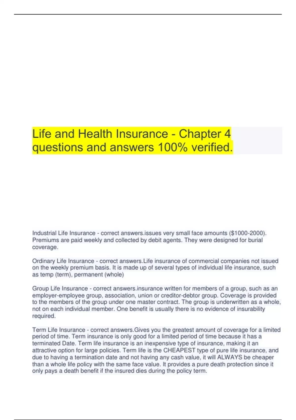 Life and Health Insurance - Chapter 4 questions and answers 100% verified. Industrial Life Insurance - correct s very small face amounts ($). Premiums are paid weekly and collected by debit agents. They were designed for burial coverage. Ordinary Life Insurance - correct answers.Life insurance of commercial companies not issued on the weekly premium basis. It is made up of several types of individual life insurance, such as temp (term), permanent (whole) Group Life Insurance - correct ance written for members of a group, such as an employer-employee group, association, union or creditor-debtor group. Coverage is provided to the members of the group under one master contract. The group is underwritten as a whole, not on each individual member. One benefit is usually there is no evidence of insurability required. Term Life Insurance - correct answers.Gives you the greatest amount of coverage for a limited period of time. Term insurance is only good for a limited period of time because it has a terminated Date. Term life insurance is an inexpensive type of insurance, making it an attractive option for large policies. Term life is the CHEAPEST type of pure life insurance, and due to having a termination date and not having any cash value, it will ALWAYS be cheaper than a whole life policy with the same face value. It provides a pure death protection since it only pays a death benefit if the insured dies during the policy term. Level Term - correct