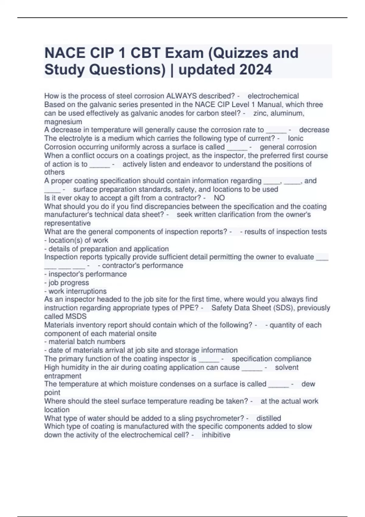NACE CIP 1 CBT Exam (Quizzes and Study Questions) | updated 2024