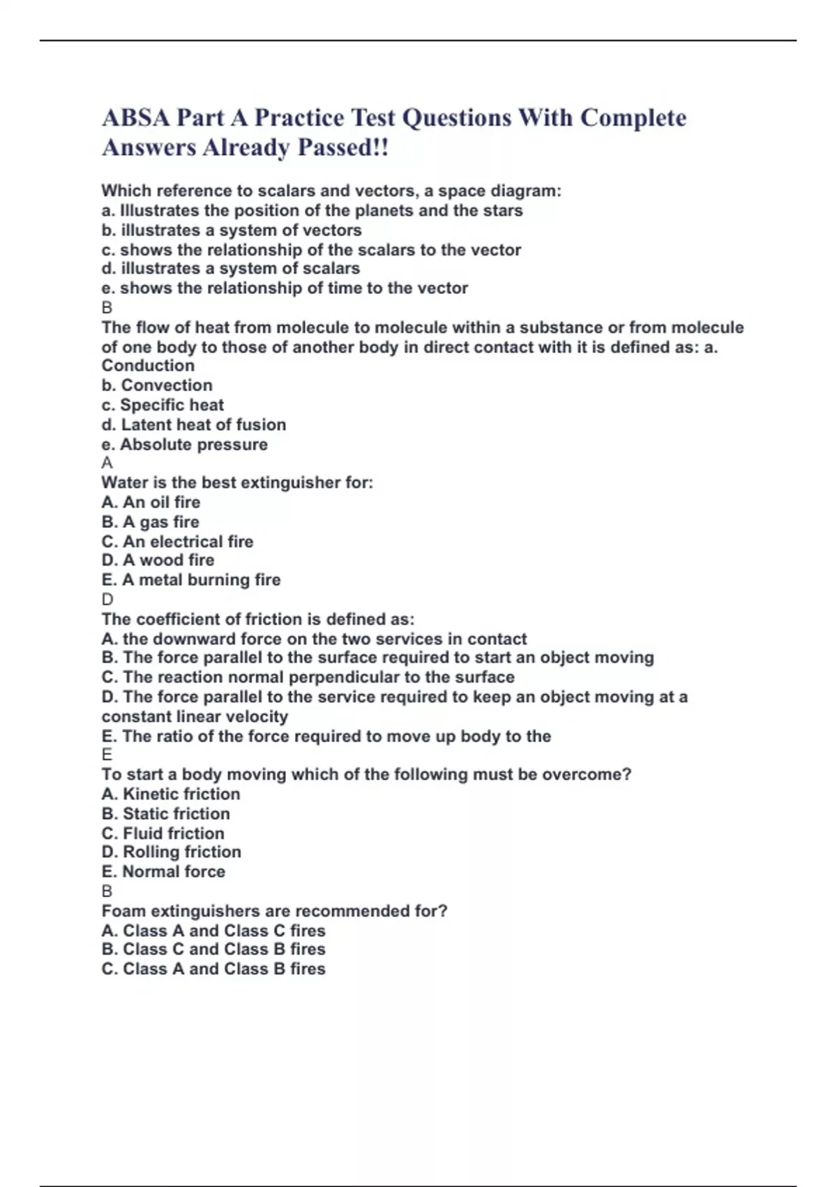 ABSA Part A Practice Test Questions With Complete Answers Already Passed!! Which reference to scalars and vectors, a space diagram: a. Illustrates the position of the planets and the stars b. illustrates a system of vectors c. shows the relationship of the scalars to the vector d. illustrates a system of scalars e. shows the relationship of time to the vector B The flow of heat from molecule to molecule within a substance or from molecule of one body to those of another body in direct contact with it is defined as: a. Conduction b. Convection c. Specific heat d. Latent heat of fusion e. Absolute pressure A Water is the best extinguisher for: A. An oil fire B. A gas fire C. An electrical fire D. A wood fire E. A metal burning fire D The coefficient of friction is defined as: A. the downward force on the two services in contact B. The force parallel to the surface required to start an object moving C. The reaction