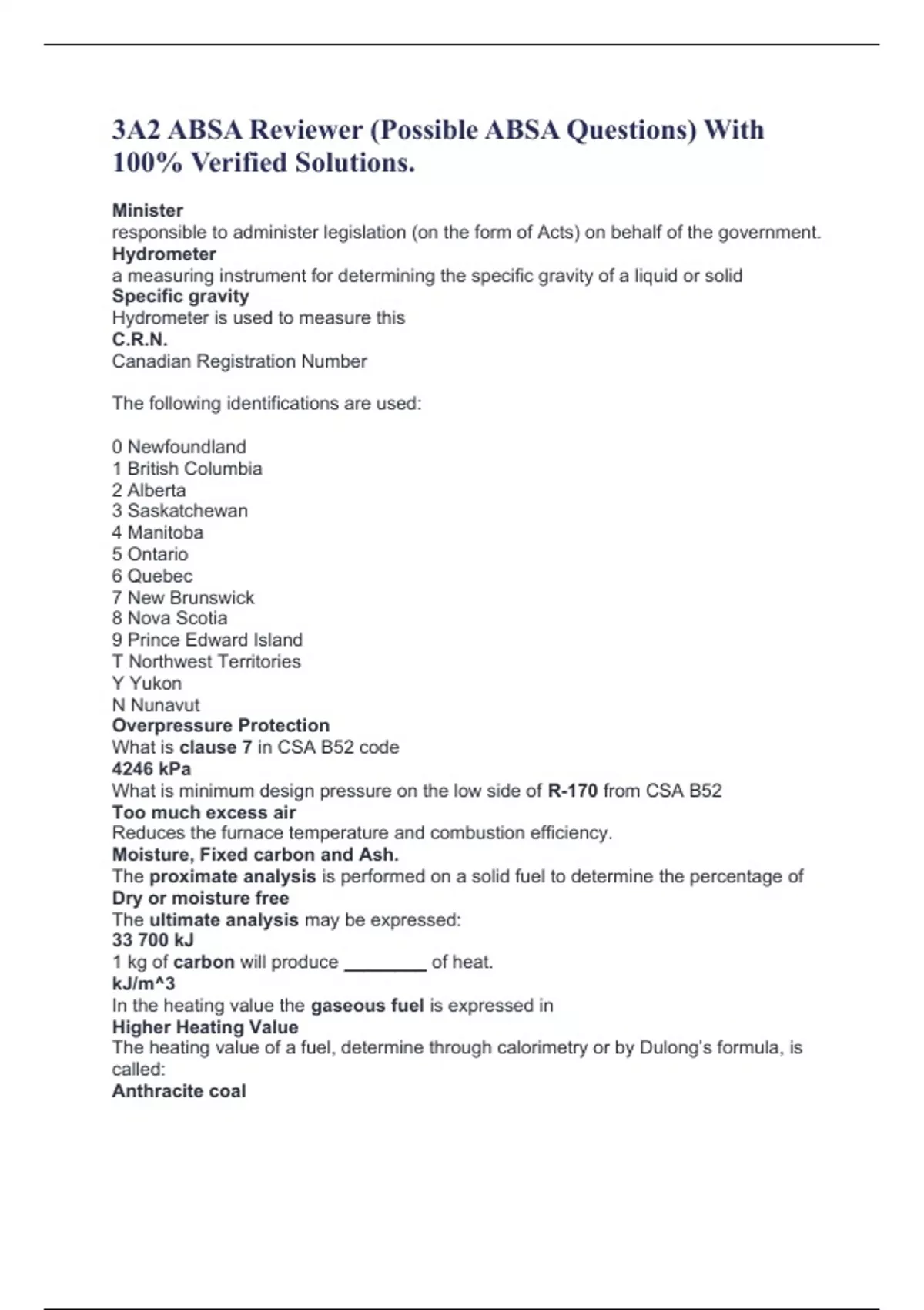 3A2 ABSA Reviewer (Possible ABSA Questions) With 100% Verified Solutions. Minister responsible to administer legislation (on the form of Acts) on behalf of the government. Hydrometer a measuring instrument for determining the specific gravity of a liquid or solid Specific gravity Hydrometer is used to measure this C.R.N. Canadian Registration Number The following identifications are used: 0 Newfoundland 1 British Columbia 2 Alberta 3 Saskatchewan 4 Manitoba 5 Ontario 6 Quebec 7 New Brunswick 8 Nova Scotia 9 Prince Edward Island T Northwest Territories Y Yukon N Nunavut Overpressure Protection What is clause 7 in CSA B52 code 4246 kPa What is min