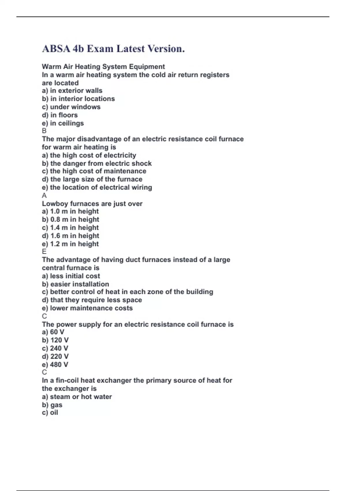 ABSA 4b Exam Latest Version. Warm Air Heating System Equipment In a warm air heating system the cold air return registers are located a) in exterior walls b) in interior locations c) under windows d) in floors e) in ceilings B The major disadvantage of an electric resistance coil furnace for warm air heating is a) the high cost of electricity b) the danger from electric shock c) the high cost of maintenance d) the large size of the furnace e) the location of electrical wiring A Lowboy furnaces are just over a) 1.0 m in height b) 0.8 m in height c) 1.4 m in height d) 1.6 m in height e) 1.2 m in height E The advantage of having duct furnaces instead of a large central furnace is a) less initial cost b) easier installation c) better con