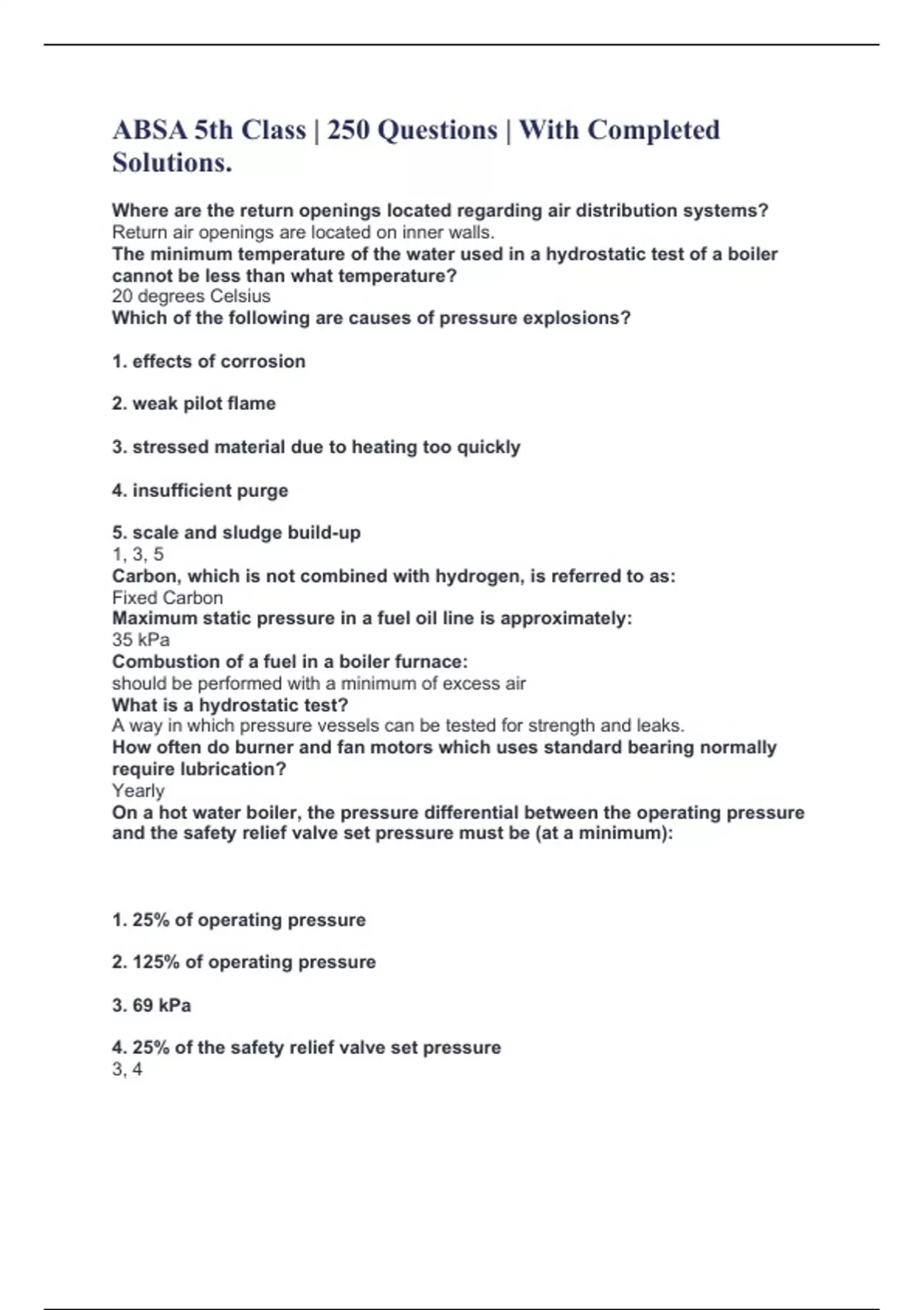 ABSA 5th Class | 250 Questions | With Completed Solutions. Where are the return openings located regarding air distribution systems? Return air openings are located on inner walls. The minimum temperature of the water used in a hydrostatic test of a boiler cannot be less than what temperature? 20 degrees Celsius Which of the following are causes of pressure explosions? 1. effects of corrosion 2. weak pilot flame 3. stressed material due to heating too quickly 4. insufficient purge 5. scale and sludge build-up 1, 3, 5 Carbon, which is not combined with hydrogen, is referred to as: Fixed Carbon Maximum static pressure in a fuel oil line is approximately: 35 kPa Combustion of a fuel in a boiler furnace: should be performed with a minimum of excess air What is a hydrostatic test? A way in which pressure vessels can be tested for strength and leaks. How often do burner and fan motors which uses standard bearing normally require lubrication? Yearly
