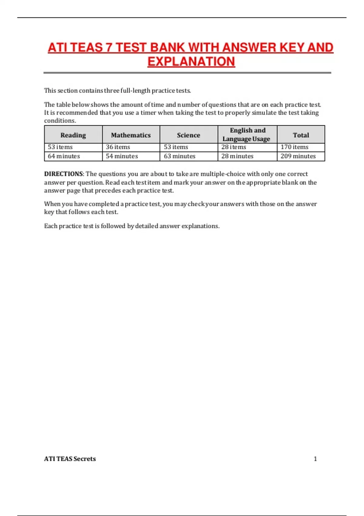 ATI TEAS 7 TEST BANK WITH ANSWER KEY AND EXPLANATION