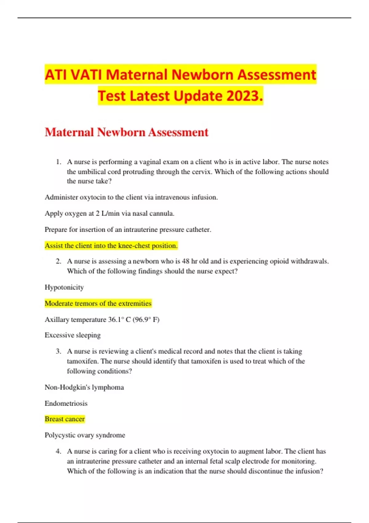 ATI VATI Maternal Newborn Assessment Test Latest Update 2023. 1. A nurse is performing a vaginal exam on a client who is in active labor. The nurse notes the umbilical cord protruding through the cervix. Which of the following actions should the nurse take? Administer oxytocin to the client via intravenous infusion. Apply oxygen at 2 L/min via nasal cannula. Prepare for insertion of an intrauterine pressure catheter. Assist the client into the knee-chest position. 2. A nurse is assessing a newborn who is 48 hr old and is experiencing opioid withdrawals. Which of the following findings should the nurse expect? Hypotonicity Moderate tremors of the extremities Axillary temperature 36.1° C (96.9° F) Excessive sleeping 3. A nurse is reviewing a client's medical record and notes that the client is taking tamoxifen. The nurse should identify that tamoxifen is used to treat which of the following conditions? Non-Hodgkin's lymphoma Endometriosis Breast cancer Polycystic ovary syndrome 4. A nurse is caring for a client who is receiving oxytocin to augment labor. The client has an intrauterine pressure catheter and an internal fetal scalp electrode for monitoring. Which of the following is an indication that the nurse should discontinue the infusion? Contraction frequency every 3 min Contraction duration of 100 seconds Fetal heart rate with moderate variability Fetal heart rate of 118/min 5. A nurse providing dietary teaching for a client who is at 29 weeks of gestation and has phenylketonuria. Which of the following suggested foods should the nurse include in the teaching? A peanut butter sandwich on wheat bread A sliced apple and red grapes A chocolate chip cookie with a glass of skim milk A scrambled egg with cheddar cheese
