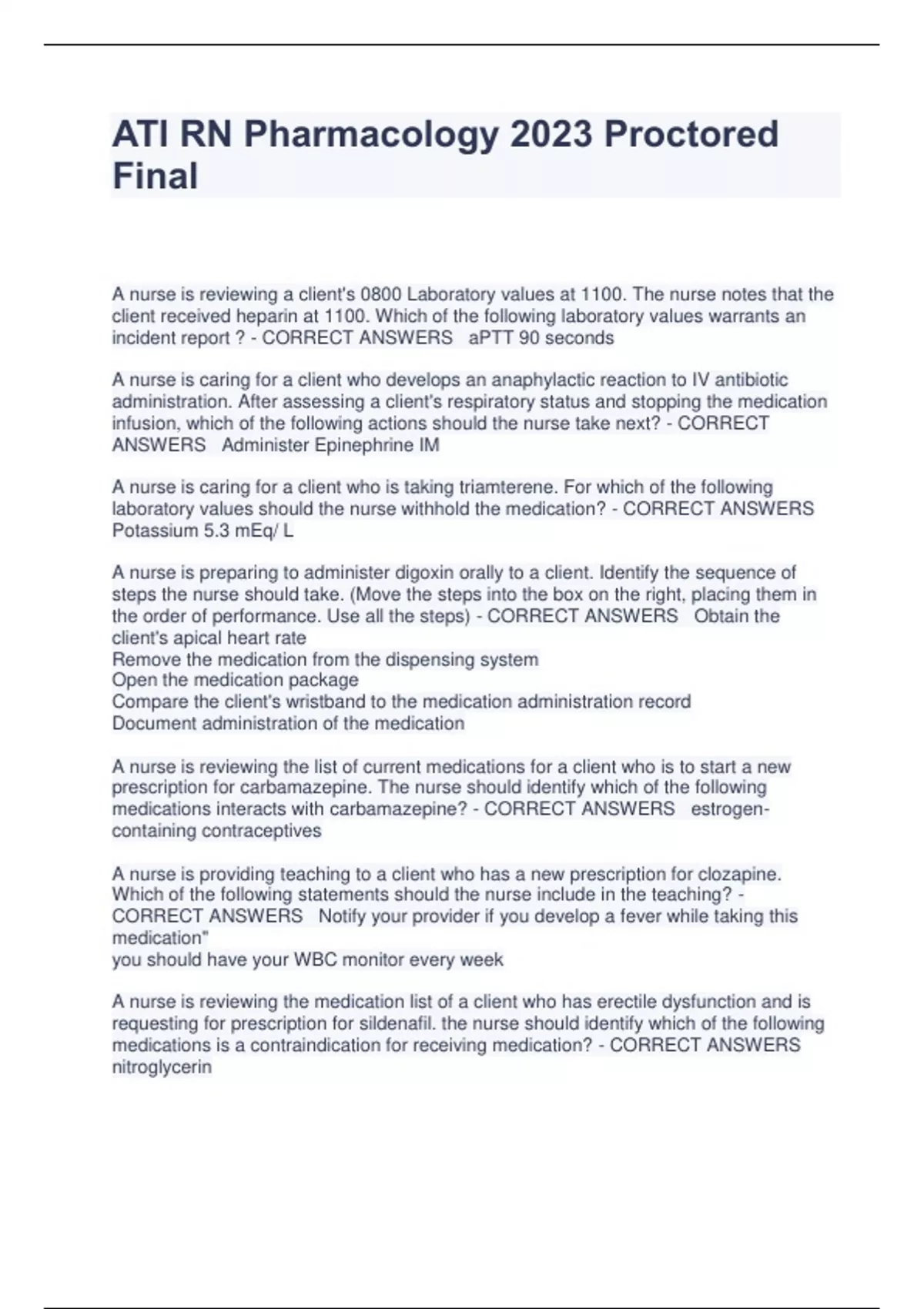 ATI RN Pharmacology 2023 Proctored Final A nurse is reviewing a client's 0800 Laboratory values at 1100. The nurse notes that the client received heparin at 1100. Which of the following laboratory values warrants an incident report ? - CORRECT ANSWERS aPTT 90 seconds A nurse is caring for a client who develops an anaphylactic reaction to IV antibiotic administration. After assessing a client's respiratory status and stopping the medication infusion, which of the following actions should the nurse take next? - CORRECT ANSWERS Administer Epinephrine IM A nurse is caring for a client who is taking triamterene. For which of the following laboratory values should the nurse withhold the medication? - CORRECT ANSWERS Potassium 5.3 mEq/ L A nurse is preparing to administer digoxin orally to a client. Identify the sequence of steps the nurse should take. (Move the steps into the box on the right, placing them in the order of performance. Use all the steps) - CORRECT ANSWERS Obtain the client's apical heart rate Remove the medication from the dispensing system Open the medication package Compare the client's wristband to the medication administration record Document administration of the medication A nurse is reviewing the list of current medications for a client who is to start a new prescription for carbamazepine. The nurse should identify which of the following medications interacts with carbamazepine? - CORRECT ANSWERS estrogencontaining contraceptives A nurse is providing teaching to a client who has a new prescription for clozapine. Which of the following statements should the nurse include in the teaching? - CORRECT ANSWERS Notify your provider if you develop a fever while taking this medication" you should have your WBC monitor every week A nurse is reviewing the medication list of a client who has erectile dysfunction and is requesting for prescription for sildenafil. the nurse should identify which of the following medications is a contraindication for receiving medication? - CORRECT ANSWERS nitroglycerin A nurse in a medical surgical unit is preparing to administer an influenza vaccine to a client. The client tells the nurse I no longer want this vaccine. Which of the following responses should the nurse make? - CORRECT ANSWERS the influenza vaccine this strongly and coverage but I understand you would like to decline right now A nurse is discussing adverse reactions to pain medications in older adults clients with a newly licensed nurse. Which of the following findings should the nurse include as risk factors for an adverse drug reaction? select all that applies - CORRECT ANSWERS multiple health problems decrease percentage of body fat decreased renal function A nurse is reviewing a client's medical record before administering acetaminophen 650 mg by mouth every 6 hours. Which of the following findings indicate a need for the nurse to notify the provider? - CORRECT ANSWERS history of alcohol use disorder a nurse is caring for a client who has hyponatremia and is receiving an infusion of a prescribed hypertonic solution. Which of the following findings should indicate to the nurse that the treatment is effective? - CORRECT ANSWERS improve cognition A nurse is reviewing the laboratory results of a client who is receiving genital medicine for Staphylococcus. Which of the following findings should the nurse report to there immediately? - CORRECT ANSWERS fasting blood glucose 130 mg A nurse is reviewing the laboratory results of a client who is receiving Heparin by continuous IV infusion. Which of the following Results indicates the nurse should decrease the infusion rate? - CORRECT ANSWERS aPTT 90 sec The nurse is caring for a client who has diabetes mellitus and is taking Pioglitazone. The nurse should plan to monitor the client for which of the following adverse effects? - CORRECT ANSWERS orthostatic hypotension A nurse is caring for a client who is receiving ceftriaxone intravenously. Which of the following manifestations should the nurse identify as an allergic reaction? - CORRECT ANSWERS Hypotension A nurse is reviewing the laboratory results of a client who received a dose of sodium polystyrene sulfonate. Which of the following findings should a nurse identify as an indication that the medication has been effective? - CORRECT ANSWERS calcium 8 mg- under normal range potassium 4.6 meq- in normal range A nurse is caring for a client who has heart failure and is taking hydrochlorothiazide. The nurse should monitor the client for which of the following manifestations has an adverse effect of the medication? - CORRECT ANSWERS hypokalemi
