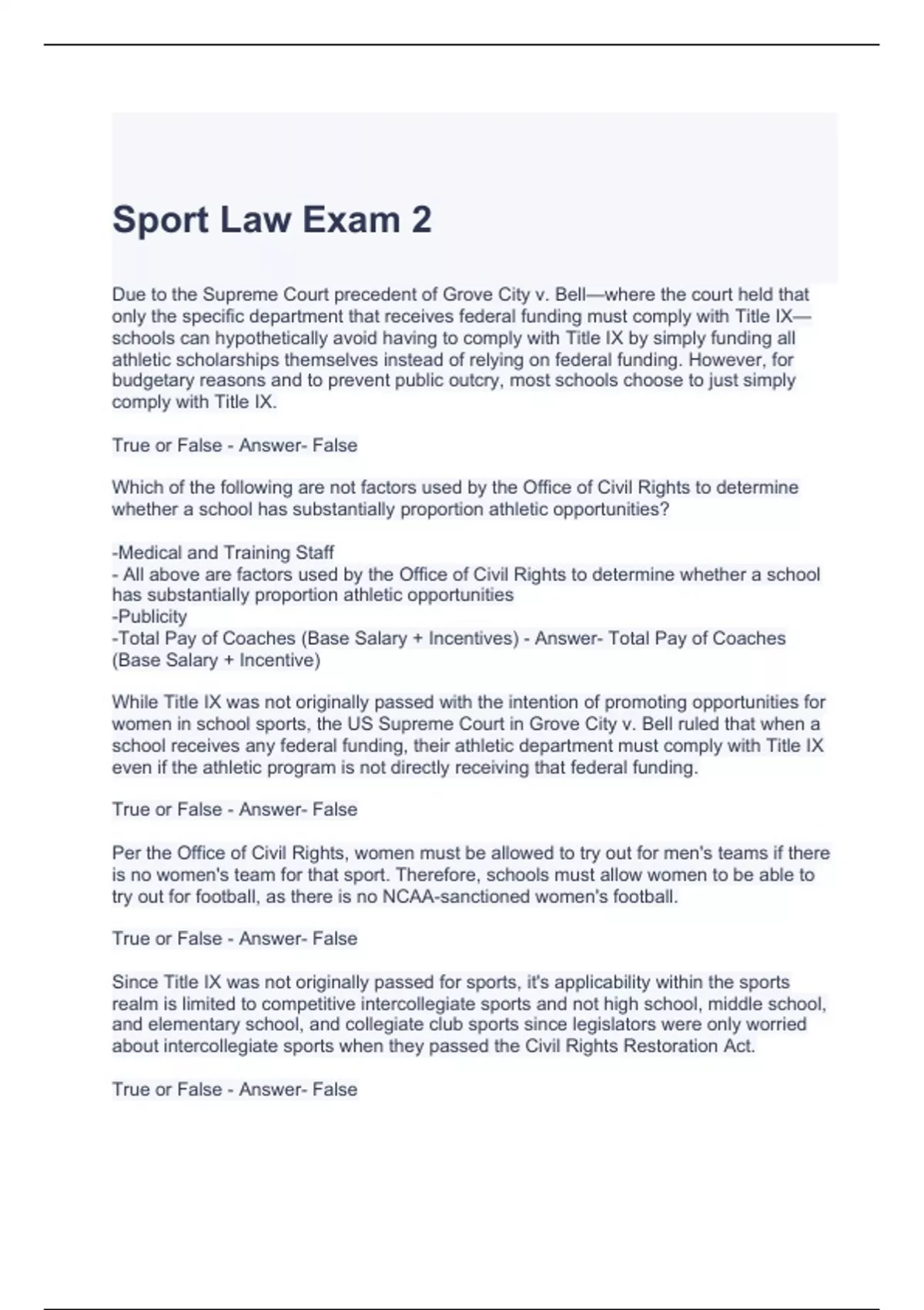Sport Law Exam 2 with Verified Answers