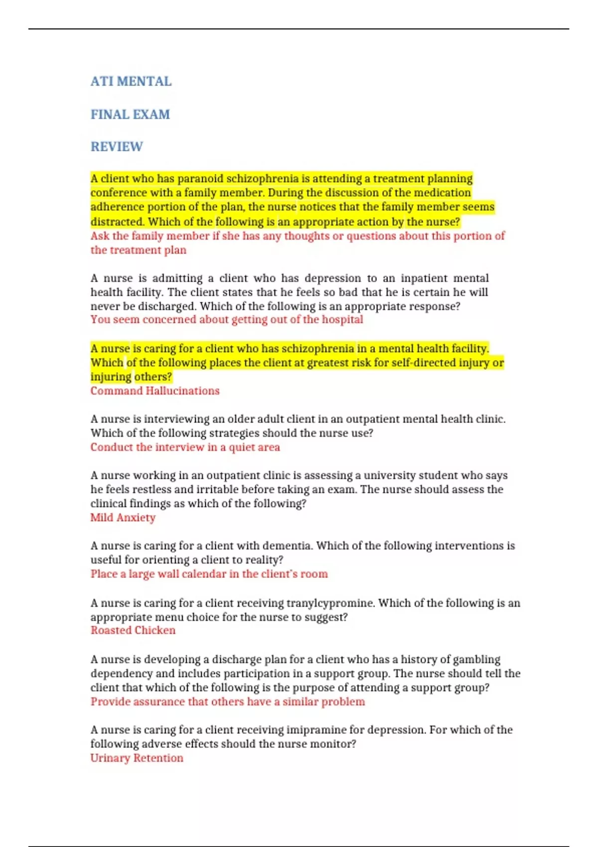 A client who has paranoid schizophrenia is attending a treatment planning conference with a family member. During the discussion of the medication adherence portion of the plan, the nurse notices that the family member seems distracted. Which of the following is an appropriate action by the nurse? Ask the family member if she has any thoughts or questions about this portion of the treatment plan A nurse is admitting a client who has depression to an inpatient mental health facility. The client states that he feels so bad that he is certain he will never be discharged. Which of the following is an appropriate response? You seem concerned about getting out of the hospital A nurse is caring for a client who has schizophrenia in a mental health facility. Which of the following places the client at greatest risk for self-directed injury or injuring others? Command Hallucinations A nurse is interviewing an older adult client in an outpatient mental health clinic. Which of the following strategies should the nurse use? Conduct the interview in a quiet area A nurse working in an outpatient clinic is assessing a university student who says he feels restless and irritable before taking an exam. The nurse should assess the clinical findings as which of the following? Mild Anxiety A nurse is caring for a client with dementia. Which of the following interventions is useful for orienting a client to reality? Place a large wall calendar in the client’s room A nurse is caring for a client receiving tranylcypromine. Which of the following is an appropriate menu choice for the nurse to suggest? Roasted Chicken A nurse is developing a discharge plan for a client who has a history of gambling dependency and includes participation in a support group. The nurse should tell the client that which of the following is the purpose of attending a support group? Provide assurance that others have a similar problem A nurse is caring for a client receiving imipramine for depression. For which of the following adverse effects should the nurse monitor? Urinary Retention A nurse is assessing a client in the emergency department. The client appears agitated, his blood pressure is 152/94 mm Hg, his heart rate is 104/min, and his pupils are dilated. The nurse should suspect intoxication with which of the following substances? Cocaine A nurse is providing teaching to a client who has a new prescription for haloperidol. Which of the following side effects should the nurse instruct the client to report to the provider? Shuffling Gait A nurse is caring for a client who has alcoholic cardiomyopathy. Which of the following laboratory values should the nurse expect? CPK During morning rounds, a nurse finds a client who has schizophrenia trembling and tearful in her bed. The client reports that a bomb was placed in her room by a family member during visiting hours. Which of the following is an appropriate action by the nurse? Assess the client for evidence of a perceptual disturbance A nurse is meeting with a client being discharged from a substance use disorder treatment program. Which of the following client statements indicates the client is planning to make a lifestyle change? I will change my route going home from work so I don’t pass my favorite bar A nurse working in a clinic is assessing a client whose partner died 4 months ago. Which of the following statements indicates the client is at risk for complicated grief? I feel so empty without my wife; it’s hard to get up every morning A nurse is caring for a client who has schizophrenia. The treatment plan is for the client to increase his autonomy from his parents. Prior to discharge, the nurse should plan to Schedule a family conference A nurse is obtaining a health history during a client's admission to a mental health facility. The client begins to talk on her cell phone. When the client finishes talking, she reports to the nurse “That was the president, I leave in the morning on my new mission.” Which of the following is an appropriate response? How long have you been having conversations with the president? A nurse is providing teaching to a client who is to be discharged from an inpatient detoxification program and plans to attend Alcoholics Anonymous. Which of the following statements by the client indicates an understanding of the teaching? I will use peer support to maintain my abstinence While observing group therapy, a nurse recognizes that a client is behaving in a way suggestive of dependent personality disorder. Which of the following behaviors is consistent with this condition? The client needs excessive external input to make everyday decisions A nurse is leading a group therapy session when a client becomes agitated and yells, “Listening to all of you is making me worse!” Which of the following is an appropriate response? You sound angry and frustrated. Tell us more about how you are feeling. A nurse is planning to teach a group of parents about healthy adolescent behavior. Which of the following information should the nurse include? Exhibits a realistic self-concept A nurse is facilitating a bereavement support group and observes that one member remains silent, even after attending several sessions. Which of the following strategies should the nurse use to encourage the member’s participation? Divide the group into pairs to discuss a topic, then summarize the discussion to the group. When admitting a client to an inpatient mental health facility, a nurse notices that the client seems withdrawn and appears fearful. To establish a trusting nurse-client relationship, the nurse should first Inform the client that her admission will be confidential A nurse is caring for a child who has conduct disorder and is behaving in a destructive manner, throwing objects, and kicking others. Which of the following therapeutic nursing interventions is the highest priority? Use a therapeutic holding technique A nurse is assessing a client who has schizophrenia.