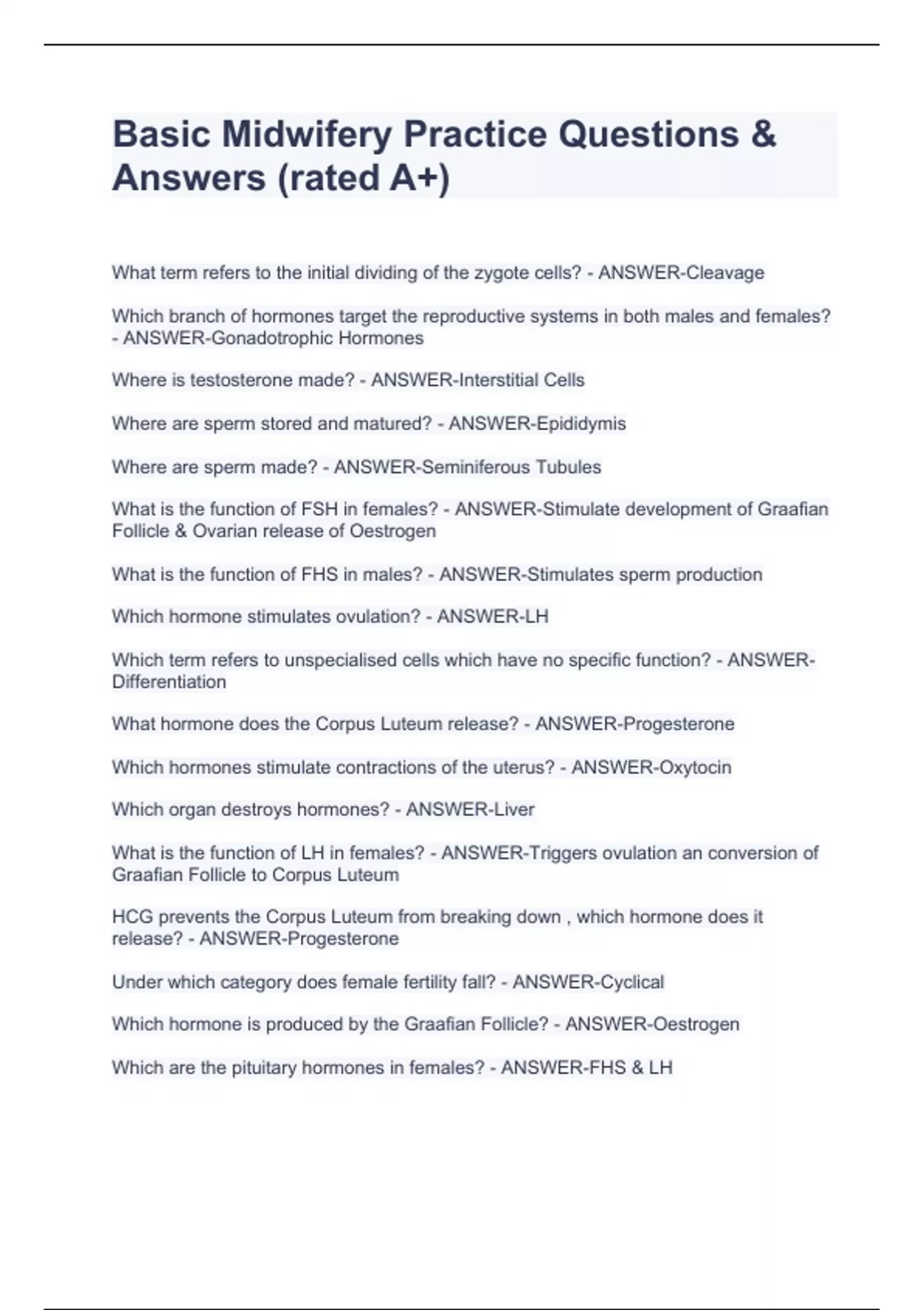 Basic Midwifery Practice Questions & Answers (rated A+) Basic Midwifery Practice Questions & Answers (rated A+) Basic Midwifery Practice Questions & Answers (rated A+) What term refers to the initial dividing of the zygote cells? - ANSWER-Cleavage Which branch of hormones target the reproductive systems in both males and females? - ANSWER-Gonadotrophic Hormones Where is testosterone made? - ANSWER-Interstitial Cells Where are sperm stored and matured? - ANSWER-Epididymis Where are sperm made? - ANSWER-Seminiferous Tubules What is the function of FSH in females? - ANSWER-Stimulate development of Graafian Follicle & Ovarian release of Oestrogen