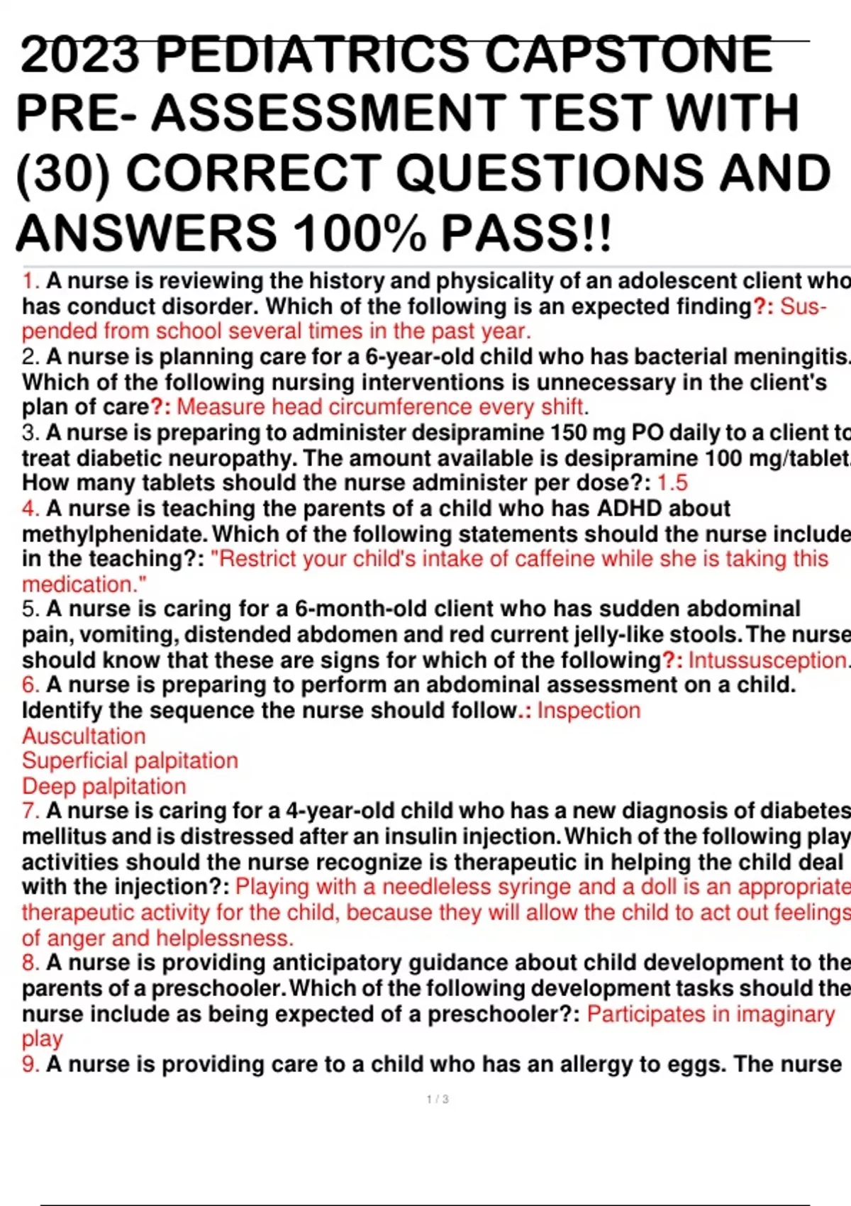 2023 PEDIATRICS CAPSTONE PRE- ASSESSMENT TEST WITH (30) CORRECT QUESTIONS AND ANSWERS 100% PASS!!