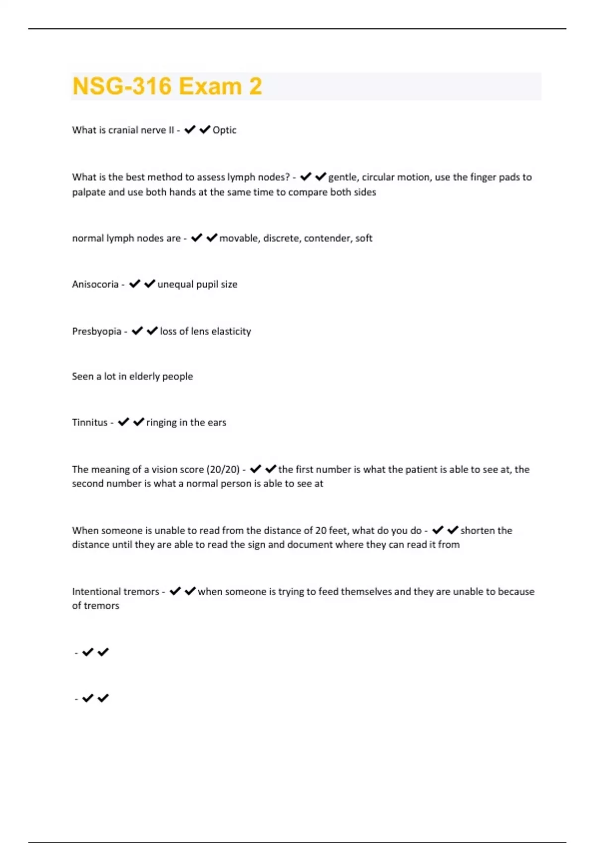 What is cranial nerve II -Optic What is the best method to assess lymph nodes? - gentle, circular motion, use the finger pads to palpate and use both hands at the same time to compare both sides normal lymph nodes are - movable, discrete, contender, soft Anisocoria - unequal pupil size Presbyopia - loss of lens elasticity Seen a lot in elderly people Tinnitus - ringing in the ears The meaning of a vision score (20/20) - the first number is what the patient is able to see at, the second number is what a normal person is able to see at When someone is unable to read from the distance of 20 feet, what do you do - shorten the distance until they are able to read the sign and document where they can read it from Intentional tremors - when someone is trying to feed themselves and they are unable to because of tremors - - s/s of (seasonal) allergy rhinitis - sneezing runny nose stuffy nose itchy nose coughing sore or scratchy throat itchy eyes water eyes how reflexes are documented - 4 = very brisk, hyperactive with clonus, indicative of disease 3 = brisker than average, may indicate disease 2 = average, normal 1 = diminished, low normal, or occurs with reinforcement 0 = no response What is the Romberg test - assesses ability of vestibular apparatus in inner ear to help maintain standing balance. person stands with feet together and arms at sides; when in stable position, ask person to close eyes and hold position for about 20 seconds tests balance What is a +/- Romberg test - + Romberg test - pt. sways and is unable to hold posture and balance CN I - Olfactory, smell, sensory test by occluding one nostril at a time, eyes closed and trying to identify smellsCN II - Optic, vision, sensory test visual acuity and visual fields by confrontation - observe pt. walking and if they can move around w/o bumping into anything CN III - Oculomotor, eye movement, motor What is CN IV - trochlear, eye movement, motor What is CN V - trigeminal Motor - mastication (palpate temporal and master muscles as person clenches teeth) Sensory - sensations in ophthalmic, maxillary and mandibular (close pt. eyes, test light touch sensation by touching cotton wisp to designated ares on persons face) What is CN VI - abducens, eye movement, motor What is CN VII - facial What is CN VIII - Acoustic (vestibulocochlear) What is CN IX - Glossopharyngeal What is CN X - vagus What is CN XI - spinal accessoryWhat is CN XII - hypoglossal