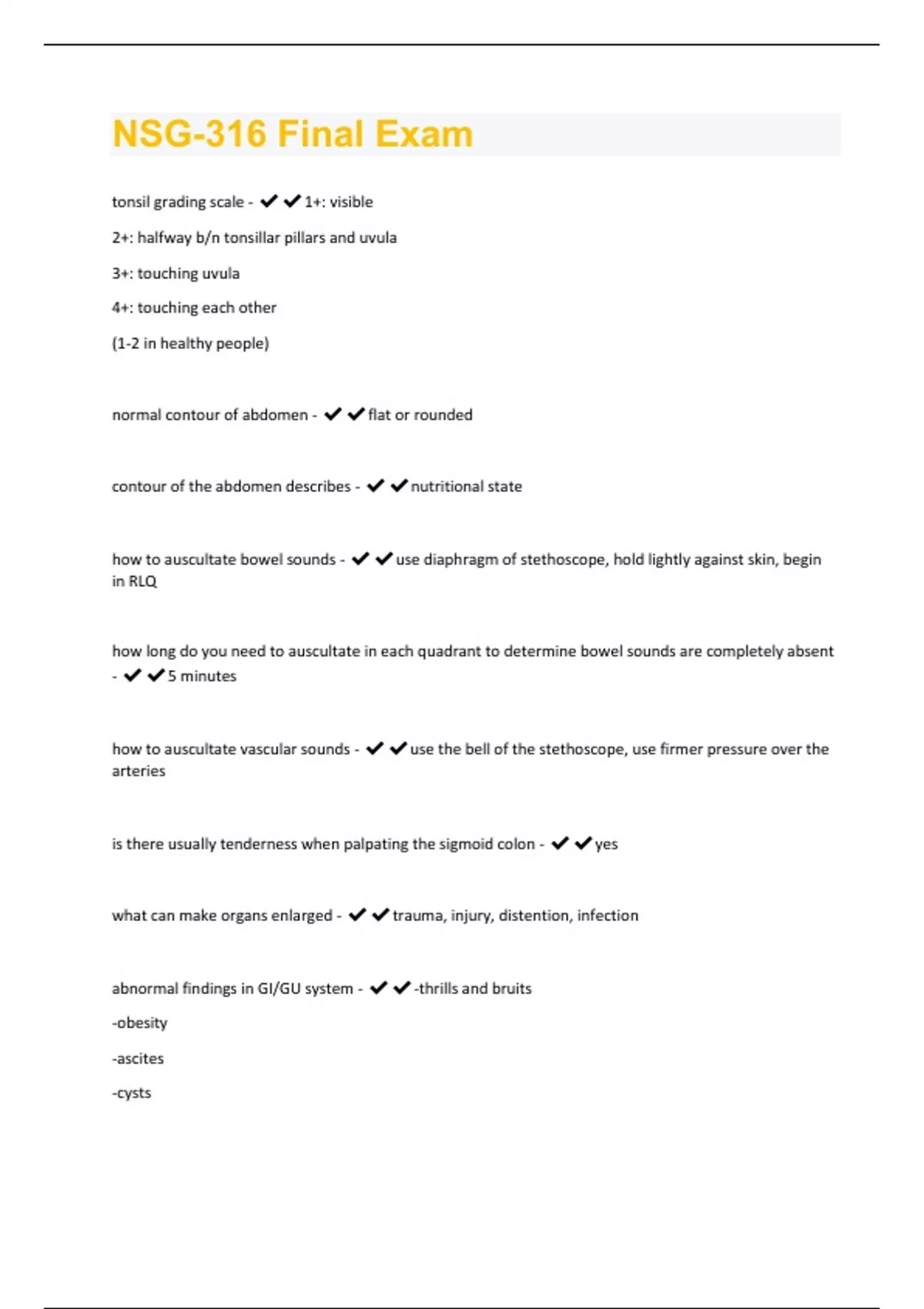 tonsil grading scale - 1+: visible 2+: halfway b/n tonsillar pillars and uvula 3+: touching uvula 4+: touching each other (1-2 in healthy people) normal contour of abdomen - flat or rounded contour of the abdomen describes - nutritional state how to auscultate bowel sounds - use diaphragm of stethoscope, hold lightly against skin, begin in RLQ how long do you need to auscultate in each quadrant to determine bowel sounds are completely absent - 5 minutes how to auscultate vascular sounds - use the bell of the stethoscope, use firmer pressure over the arteries is there usually tenderness when palpating the sigmoid colon - yes what can make organs enlarged - trauma, injury, distention, infection abnormal findings in GI/GU system - -thrills and bruits -obesity -ascites -cysts-tumor -hypo/hyperactive bowel sounds ethnic differences in the lips - black people may have blue lips and a dark line on the gingival margin GI system changes in the aging adult - -salivation decreases -dec sense of taste -delayed esophageal emptying and gastric acid secretion -dec liver size (normal liver functions) -dec drug metabolism -frequent constipation borborygmus - hyperactive bowel sounds melena can be caused by - taking iron meds
