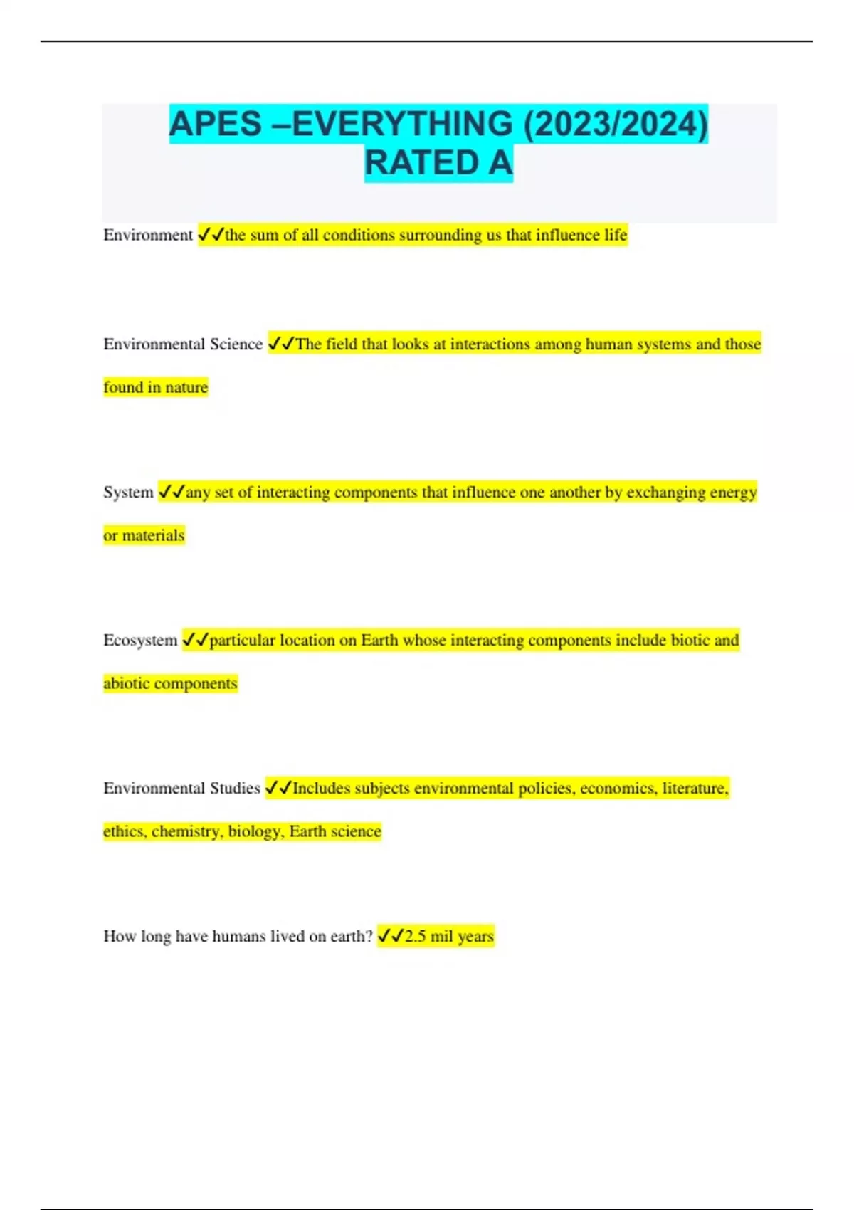 APES –EVERYTHING (2023/2024) RATED A Environment the sum of all conditions surrounding us that influence life Environmental Science The field that looks at interactions among human systems and those found in nature System any set of interacting components that influence one another by exchanging energy or materials Ecosystem particular location on Earth whose interacting components include biotic and abiotic components Environmental Studies Includes subjects environmental policies, economics, literature, ethics, chemistry, biology, Earth science How long have humans lived on earth? 2.5 mil years Postitive Human Activites Native Americans on Great Plains used fire to capture animals for food, these fires kept trees from encroaching on plains allowing a window for an entire ecosystem to develop. Technology + Dramatic human population growth =? increase rate and scale of our global environmental impact How Do Humans Alter Natural Systems? modern cities - electricity, running water, sewage systems, public transportations. Cities also cover land that was once natural habitat so species living there relocate or go extinct. Ecosystem Services the processes by which life supporting resources such as clean, timber, fisheries, and agricultural crops are produced. 5 Global Scale Indicators 1. Biological Diversity 2. Food Production 3. Average global surface temp & CO2 in Atmosphere 4. Human Population 5. Resource depletion Genetic Diversity A measure of genetic variation among individuals in a population. Species Diversity number of species in a region / particular type of habitat Why are frogs important? used to study land and water habitats Speciation evolution of a new species (slow process) 1-3 new species a year world wide. How many species go extinct each year? 10,000+ What does loss in biodiversity tell us? natural systems are facing strains unlike any in the recent past Food Production our ability to grow food to nourish human population. What factors influence worldwide grain production irrigation, human labor/energy, climatic conditions, amount/quality of land. Why has grain production not kept up with population growth? 1. productivity of agricultural ecosystems down bc of soil degradation, crop disease and unfavorable weather conditions. 2. Demand outpaces supply What has lead to the increase in atmospheric CO2? Anthropogenic activity Examples of