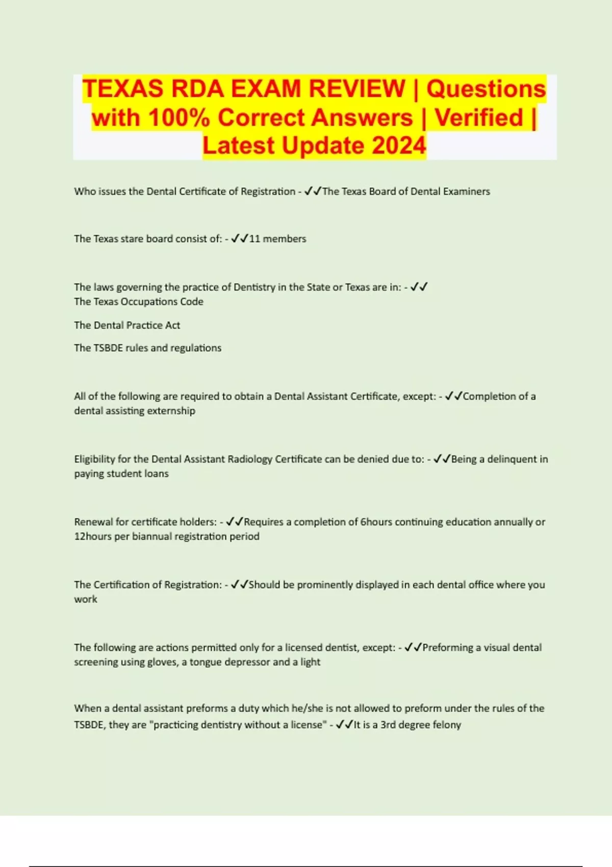 TEXAS RDA EXAM REVIEW | Questions with 100% Correct Answers | Verified | Latest Update 2024