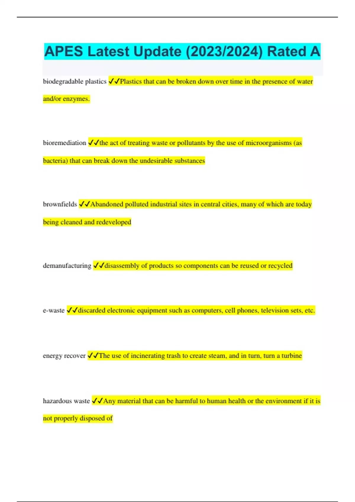 APES Latest Update (2023/2024) Rated A biodegradable plastics Plastics that can be broken down over time in the presence of water and/or enzymes. bioremediation the act of treating waste or pollutants by the use of microorganisms (as bacteria) that can break down the undesirable substances brownfields Abandoned polluted industrial sites in central cities, many of which are today being cleaned and redeveloped demanufacturing disassembly of products so components can be reused or recycled e-waste discarded electronic equipment such as computers, cell phones, television sets, etc. energy recover The use of incinerating trash to create steam, and in turn, turn a turbine hazardous waste Any material that can be harmful to human health or the environment if it is not properly disposed of mass burn A method of incineration of solid waste in which material is fed into a furnace on movable metal grates storage The process by which information is maintained over a period of time photodegradable plastics break down when exposed to ultraviolet radiation recycling the act of processing used or abandoned materials for use in creating new products refuse-derived fuel processing of solid waste to remove metal, glass, and other unburnable materials; organic residue is shredded, formed into pellets, and dried to make fuel for power plants sanitary landfills The most common method of disposal of solid waste, by compacting it and burying it under a shallow layer of soil secure landfills a solid waste disposal site lined and capped with an impermeable barrier to prevent leakage or leaching. drain tiles, sampling wells, and vent systems provide monitoring and pollution control super fund idenify and clean up the worst hazerdous waste sights throughout the U.S. waste stream The flow of solid waste that is recycled, incinerated, placed in a solid waste landfill, or disposed of in another way toxic release inventory Requires 20,000 manufacturing facilities to report annually on releases of more than 300 toxic materials