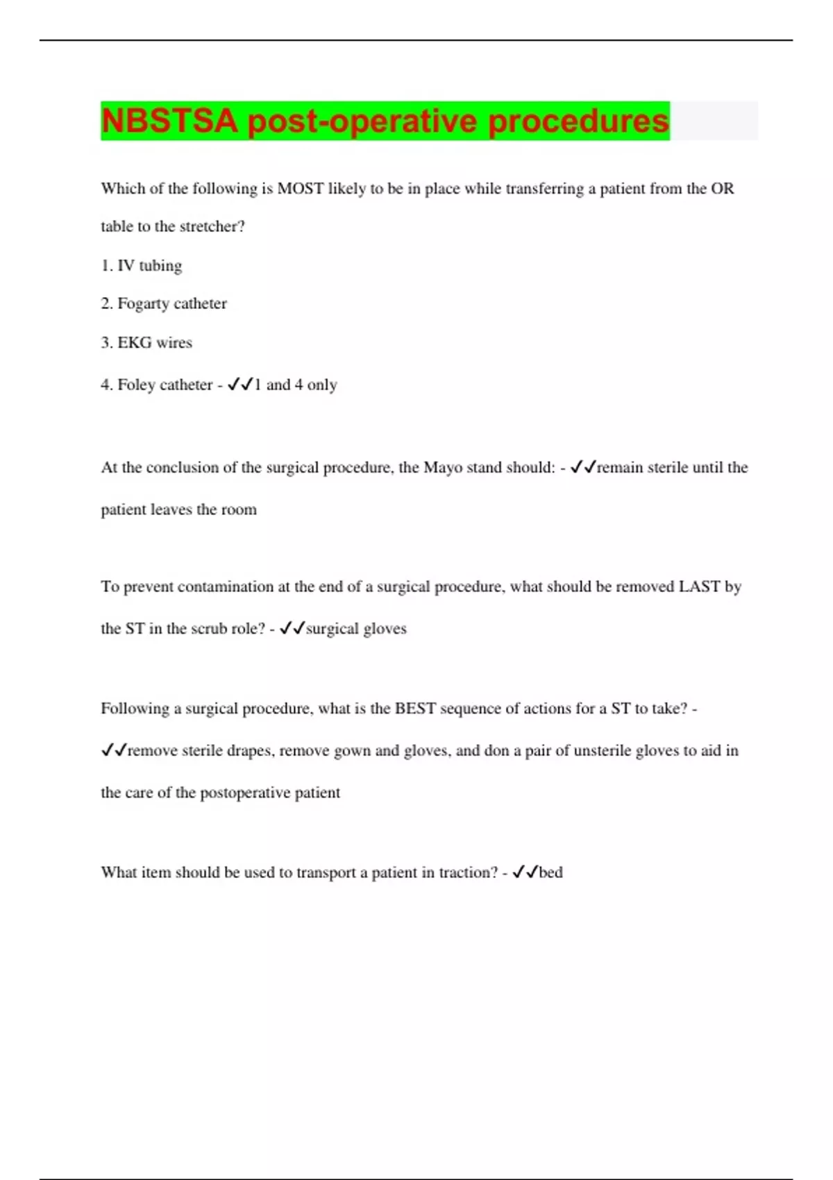 NBSTSA post-operative procedures Questions with 100% Correct Answers | Latest Update 2024 | Verified