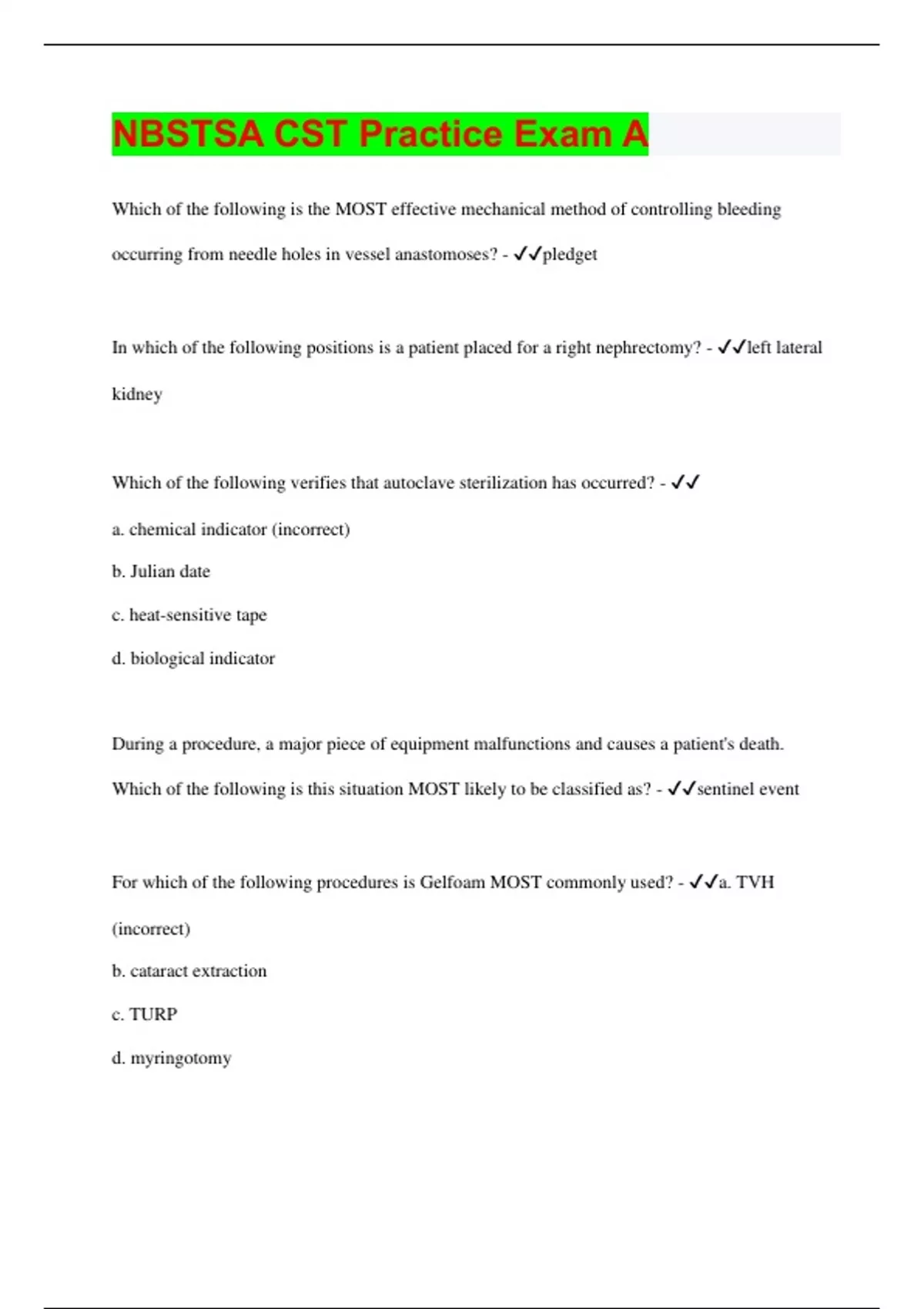 NBSTSA CST Practice Exam A Questions with 100% Correct Answers | Latest Update 2024 | Verified