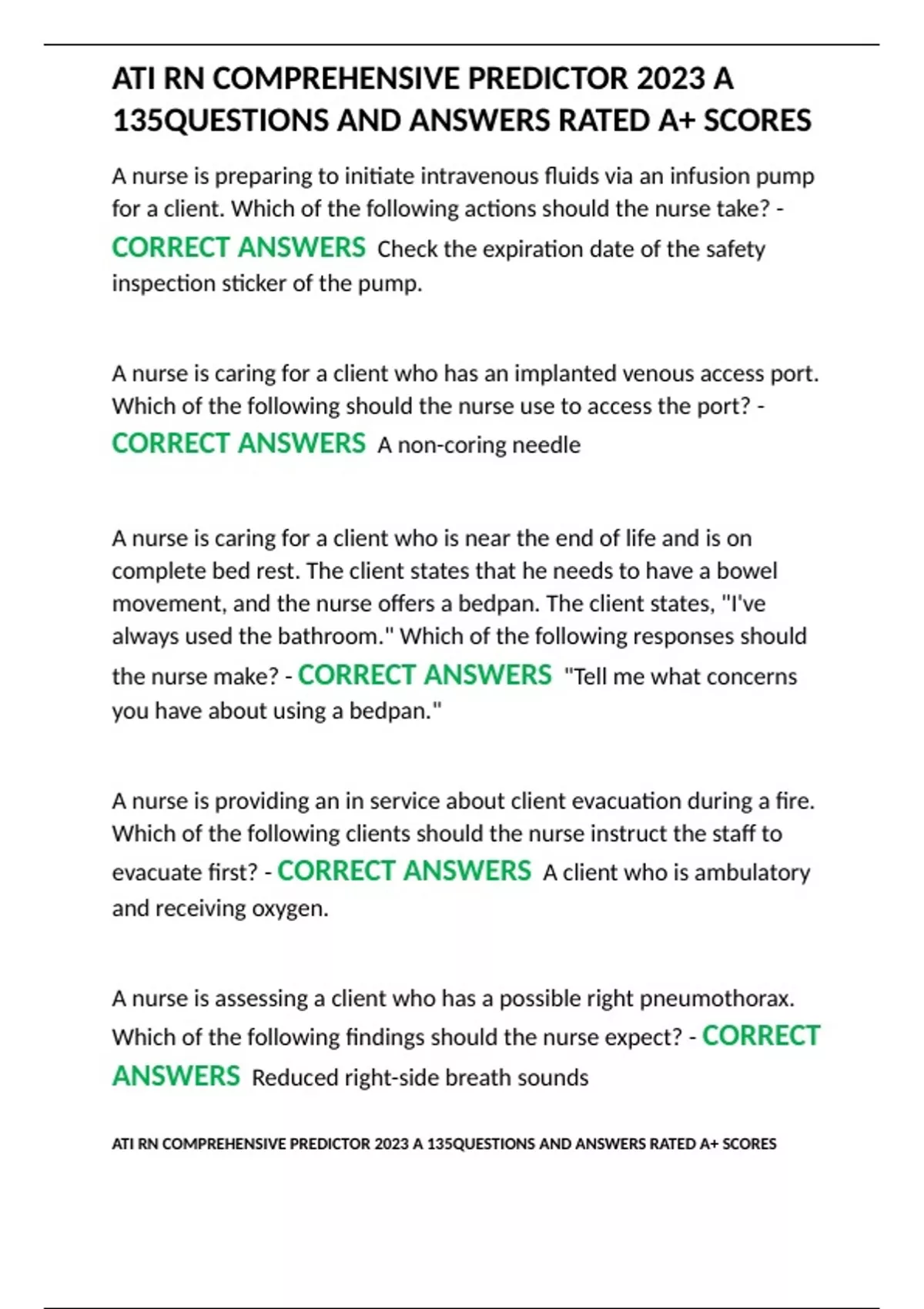 ATI RN COMPREHENSIVE PREDICTOR 2023 A 135QUESTIONS AND ANSWERS RATED A+ SCORES