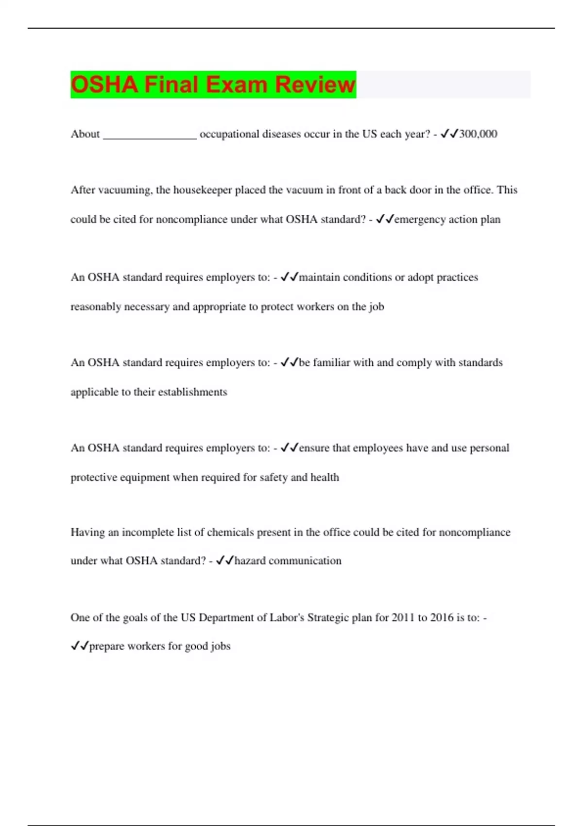OSHA Final Exam Review Questions with 100% Correct Answers | Latest Update 2024 | Verified