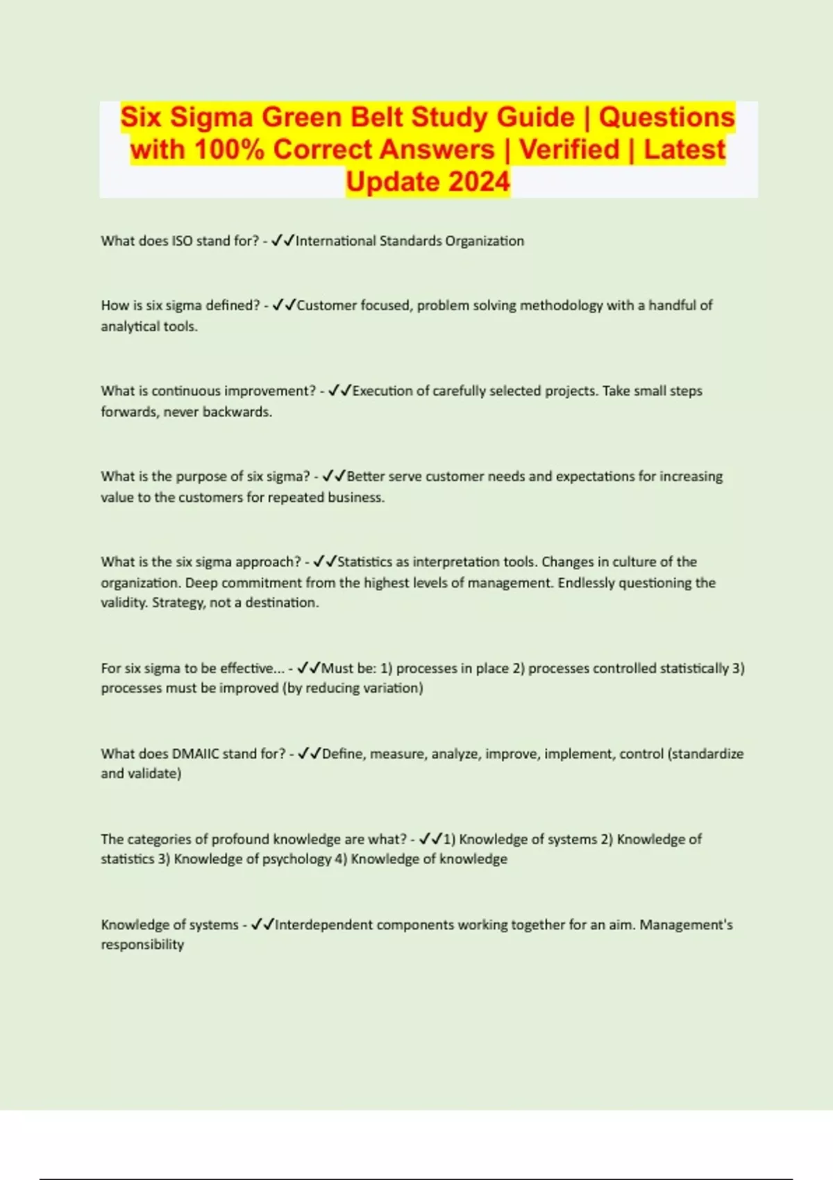 Six Sigma Green Belt Study Guide | Questions with 100% Correct Answers | Verified | Latest Update 2024